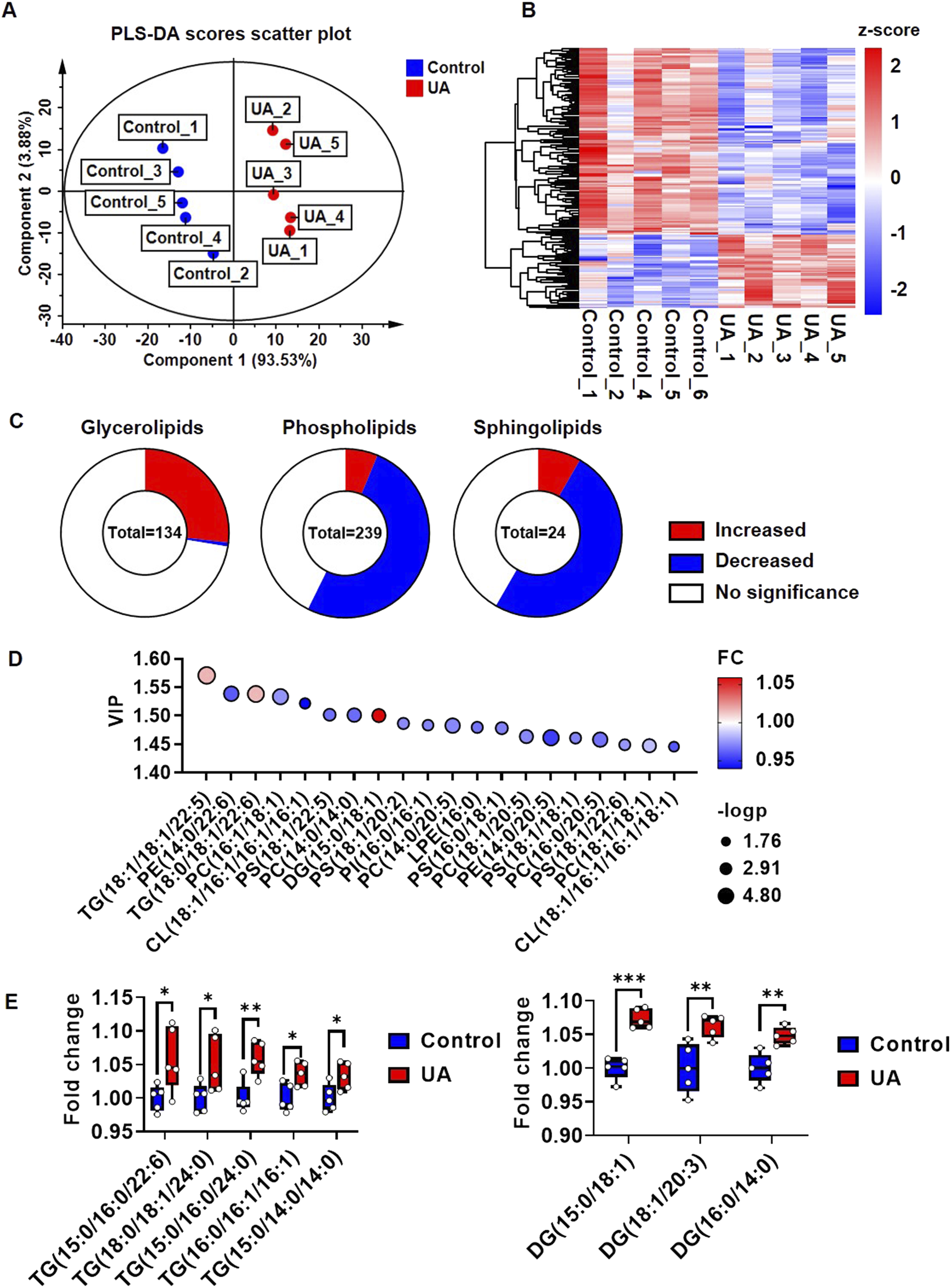 Lipidomic profile change of cardiomyocytes under UA stimulation. (A) PLS-DA score scatter plot showing the separation of control group and UA group. Cardiomyocytes were treated with 15 mg/dL UA. The cells were harvested for lipidomic analysis after 24 h treatment; (B) Heatmap showing the global view of the significant metabolites of control and UA treated cardiomyocytes; (C) Pie chart showing the changes in lipid composition under UA treated cardiomyocytes compare with control. P< 0.05 was considered as significance; (D) Bubble plots showing the top 20 significant metabolites based on VIP values; (E) Box plots showing the top five upregulated TGs and DGs. The results were normalized to the mean value of control (n = 5).