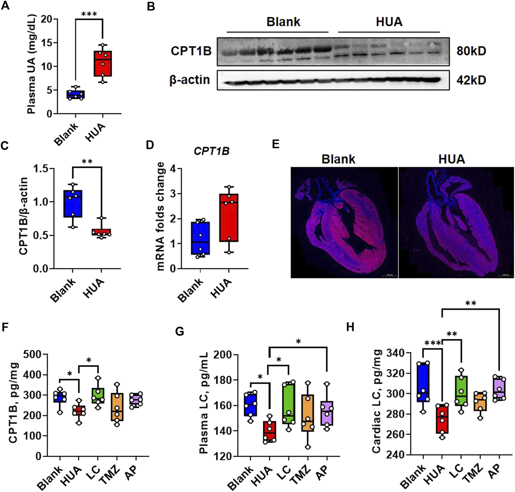 CPT1B response in early-stage HUA mice. (A) The UA concentration in plasma of blank and HUA group respectively (n = 6); (B) The protein level of CPT1B in the heart samples from blank and HUA group respectively, β-actin was used as an internal loading control; (C) The quantification of Figure 5B; (D) The mRNA folds change of CPT1B in the heart samples from blank and HUA group (n = 6); (E) The immunofluorescence reflects the distribution of CPT1B in the heart samples from blank and HUA group respectively. DAPI indicates nuclei, scale bar = 1000 μm; (F) The protein level of CPT1B in heart samples by ELISA quantification (n = 6); (G) The plasma LC concentrations by different treatment (n = 6); (H) The cardiac plasma LC concentrations by different treatment (n = 6).