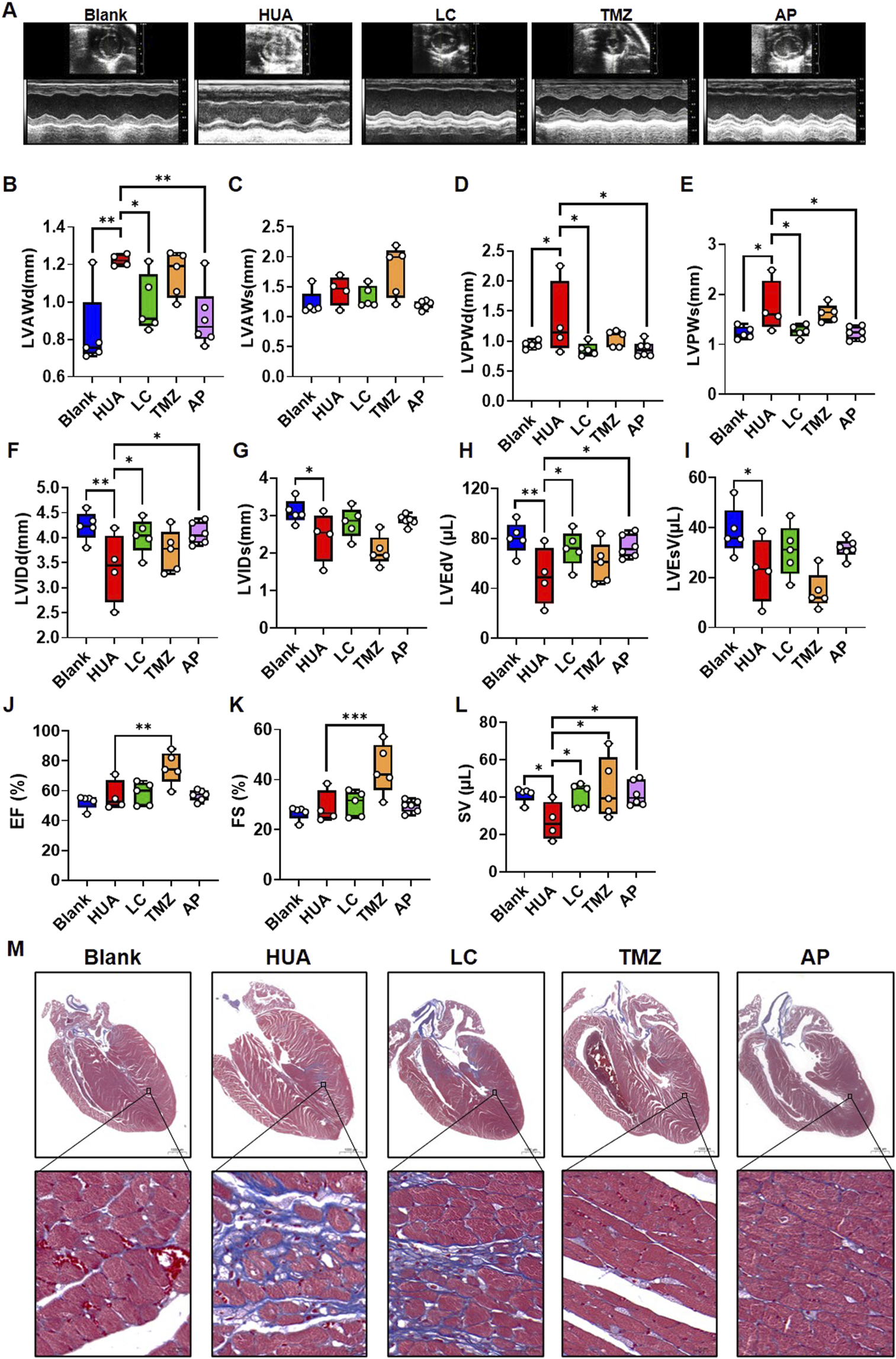 The influence of fatty acid metabolic agents’ intervention on the cardiac function of chronic HUA mice. (A) Representative photo of echocardiography examination in each group. Echocardiographic examination was performed after 8 weeks experiment. The summarized box plot of left ventricular anterior wall in diastolic-stage (B), left ventricular anterior wall in systolic-stage (C), left ventricular posterior wall in diastolic-stage (D), left ventricular posterior wall in systolic-stage (E), left ventricular internal dimension in diastolic-stage (F), left ventricular internal dimension in systolic-stage (G), left ventricular end-diastolic volume (H), left ventricular end-systolic volume (I), ejection fraction (J), fractional shortening (K), stroke volume (L). blank n = 5, HUA n = 4, LC n = 5, TMZ n = 5, AP n = 6; (M) Masson staining of the heart samples in each group after8-weeks’ treatment. Red indicates muscle, blue indicates fibrous, scale bar = 1000 μm.
