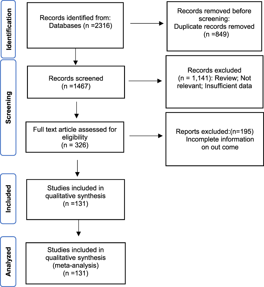 The systematic search identified two thousand three hundred sixteen records, and 849 duplicates were removed. According to titles and abstracts screening, 1,141 articles were excluded, and according to the full-text evaluation, 195 articles were considered irrelevant. Finally, 131 articles published between 1980 and 2020 were included in this meta-analysis [Abera et al. (2010), Alam et al. (2012), Amita et al. (2003), Anand et al. (1996), Araj et al. (1994), Baddam et al. (2020), Bag et al. (1998), Bakhshi et al. (2014), Bakhshi and Pourshafie (2009), Bakhshi et al. (2008), Balaji et al. (2013), Ballal and Shivananda (2002), Bani et al. (2007); Barati et al. (2015), Basu et al. (2000), Bhat et al. (2012), Bhattacharya et al. (2015), Bhattacharya et al. (2012), Bhotra et al. (2017), Bhowmick et al. (2007), Bier et al. (2015), Borkakoty et al. (2012), Campos et al. (2004), Ceccarelli et al. (2016); Ceccarelli et al. (2011), Chakraborty et al. (2001), Chandrasekhar et al. (2008), Chatterjee et al. (2007), Chhotray et al. (2002), Chomvarin et al. (2013), Chomvarin et al. (2012), Chowdhury et al. (2016), Colombo et al. (1993), Dalsgaard et al. (1998), Dalsgaard et al. (2000), Dalsgaard et al. (1996), Das et al. (2016), Das et al. (2011), Das et al. (2008), Dengo-Baloi et al., 2017, Dey et al. (2014), Dua et al. (2018), Echeverria et al. (1983), Eibach et al. (2016); Faruque et al. (2000); Fazil et al. (2011); Feglo and Sewurah (2018), Fernandez-Abreu et al. (2017), Folgosa et al. (2000), Garg et al. (2000), Goel et al. (2010), Gupta et al. (2016), Ibarra and Alvarado (2007), Iramiot et al. (2019); Islam et al. (2011); Ismail et al. (2013); Jain et al. (2016); Jaiswal et al. (2015), Kacou-N’douba et al. (2012), Kaistha et al. (2005), Kar et al. (2015), Karki et al. (2010), Kingston et al. (2009), Koley et al. (2014), Kondo et al. (2001), Krishna et al. (2006), Kumar et al. (2014), Kutar et al. (2013), Luo et al. (2013), Mandal et al. (2010), Mandal et al. (2009), Mandomando et al. (2007), Marashi et al. (2012), Mohapatra et al. (2007), Sarkar et al. (2019), Moyo et al. (2011), Mukhopadhyay et al. (1995), Okuda et al. (2007), Oyofo et al. (2002b), Oyofo et al. (2002a), Pal et al. (2006), Pal et al. (2017), Pan et al. (2008), Parveen et al. (2003), Patrick et al. (2012), Rahbar et al. (2010), Ranjbar et al. (2016), Rashed et al. (2012), Rezaie et al. (2017), Roy et al. (2012), Saidi et al. (2014), Sambe-Ba et al. (2017), Sedaghat et al. (2012), Shakya et al. (2012), Sharma et al. (2007), Talkington et al. (2011), Torane et al. (2016), Tran et al. (2012), Vijayalakshmi et al. (1997), Vinothkumar et al. (2018), Akoachere et al. (2013), Akoachere and Mbuntcha (2014), Alaoui et al. (2010), Al-Hilu et al. (2019), Amau et al. (1988), Baron et al. (2017), Baron et al. (2016), Bhanumathi et al. (2003), Bidinost et al. (2004), Bier et al. (2015), Campos et al. (2004), Ceccarelli et al. (2016), Chakraborty et al. (2001), Chomvarin et al. (2013), Dalsgaard et al. (1996), Eja et al. (2006), Falcao et al. (1998), Ibarra and Alvarado (2007), Imziln and Hassani (1994), Isaac-Márquez et al. (1998), Jagadeeshan et al. (2009), Kiiru et al. (2013), Kumar and Lalitha (2013), Li et al. (2011), Mandal et al. (2010), Mercy et al. (2014), Mishra et al. (2011), Mohapatra et al. (2007), Odjadjare and Igbinosa (2017), Onyuka et al. (2011), Osawa et al. (2020), Ottaviani et al. (2018), Prabhu et al. (2007), Radu et al. (2002), Kutar et al. (2013), Singh et al. (2018), Song et al. (2013), Wang et al. (2016), Waturangi et al. (2013), Zachariah et al. (2002), Kumaran and Citarasu (2016)].