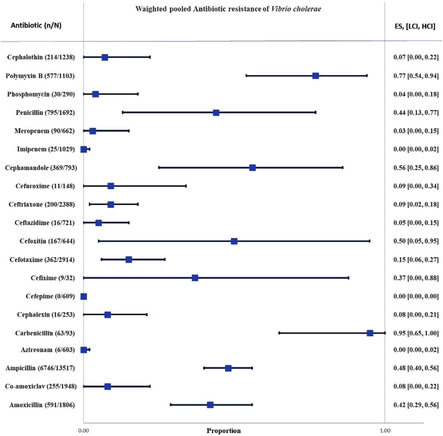 FIGURE 2. Forest plot of the weighted pooled proportion of antimicrobial-resistant Vibrio cholera. Abbreviations; Effect size or proportion of resistance (ES), number of resistant isolates (n), number of isolates (N), high confidence interval (HCI), low confidence interval (LCI).
