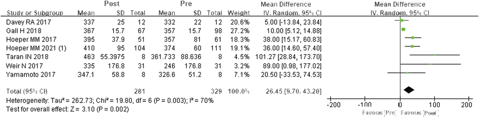 A total of seven studies were included (Davey et al., 2017; Hoeper et al., 2017; Weir et al., 2017; Yamamoto et al., 2017; Gall et al., 2018; Taran et al., 2018; Hoeper et al., 2021). According to the heterogeneity test (I2 = 69.7%, p = 0.003), there was statistical heterogeneity among the studies, so a random effects model was applied. The meta-analysis results showed that, compared to PDE-5is, riociguat could obviously improve 6MWD by an average of 26.45 m, and the difference was statistically significant (WMD = 26.45 m, 95% CIs: 9.70–43.2, p = 0.002) (Figure 2).