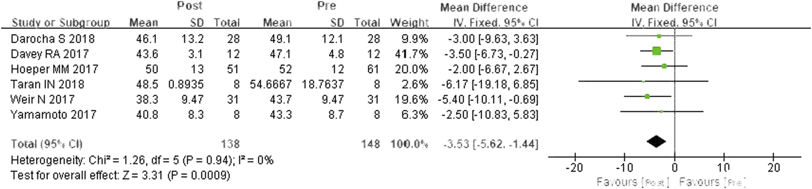 A total of five studies were included (Davey et al., 2017; Hoeper et al., 2017; Weir et al., 2017; Yamamoto et al., 2017; Darocha et al., 2018). According to the heterogeneity test (I2 = 0%, p = 0.444), there was little statistical heterogeneity among the studies, so a fixed effects model was applied. The meta-analysis results showed that PVR was decreased by 130.24 dyn·s·cm−5 after switching from PDE-5is to riociguat, and the difference was statistically significant (WMD = 130.24 dyn·s·cm−5, 95% CIs: −187.43–73.05, p < 0.0001) (Figure 4).