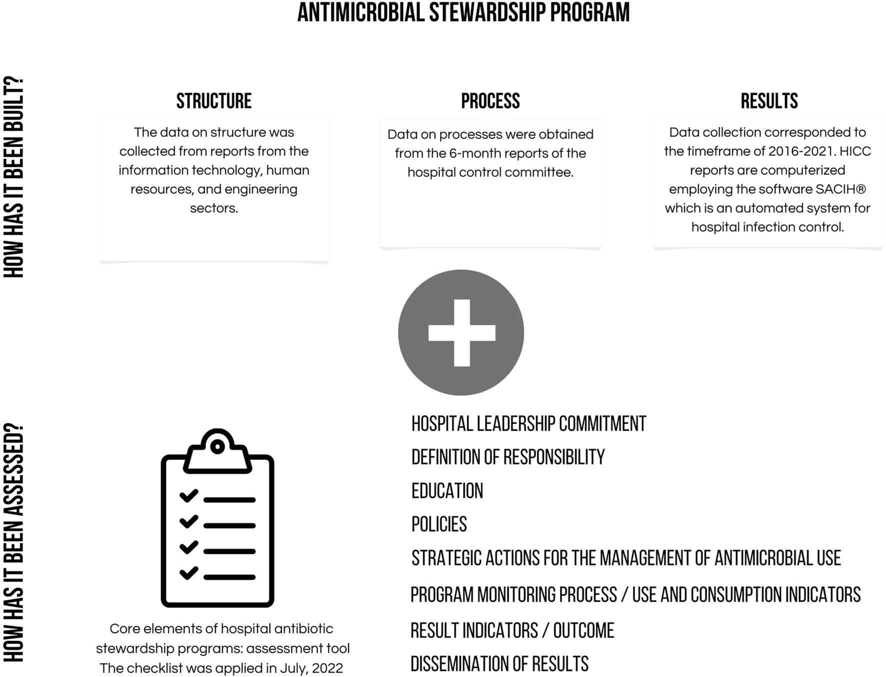 Method: This was a descriptive study with secondary data collection, including document review of the ASP. The study setting was a general public 392-bed hospital. The ASP activities were performed by the hospital infection control committee (HICC), hospital pharmacy (HP) and diagnostic support laboratory (DSL). The description of the three services mainly involved in the ASP was based on a quality assessment model involving the dimensions of “structure”, “process” and “result” proposed by Donabedian. The distribution among dimensions was guided by the checklist of essential elements of the ASP that compose the Brazilian regulatory requirements. The checklist was applied in July, 2022, and the ASP results described from 2016 to 2021.