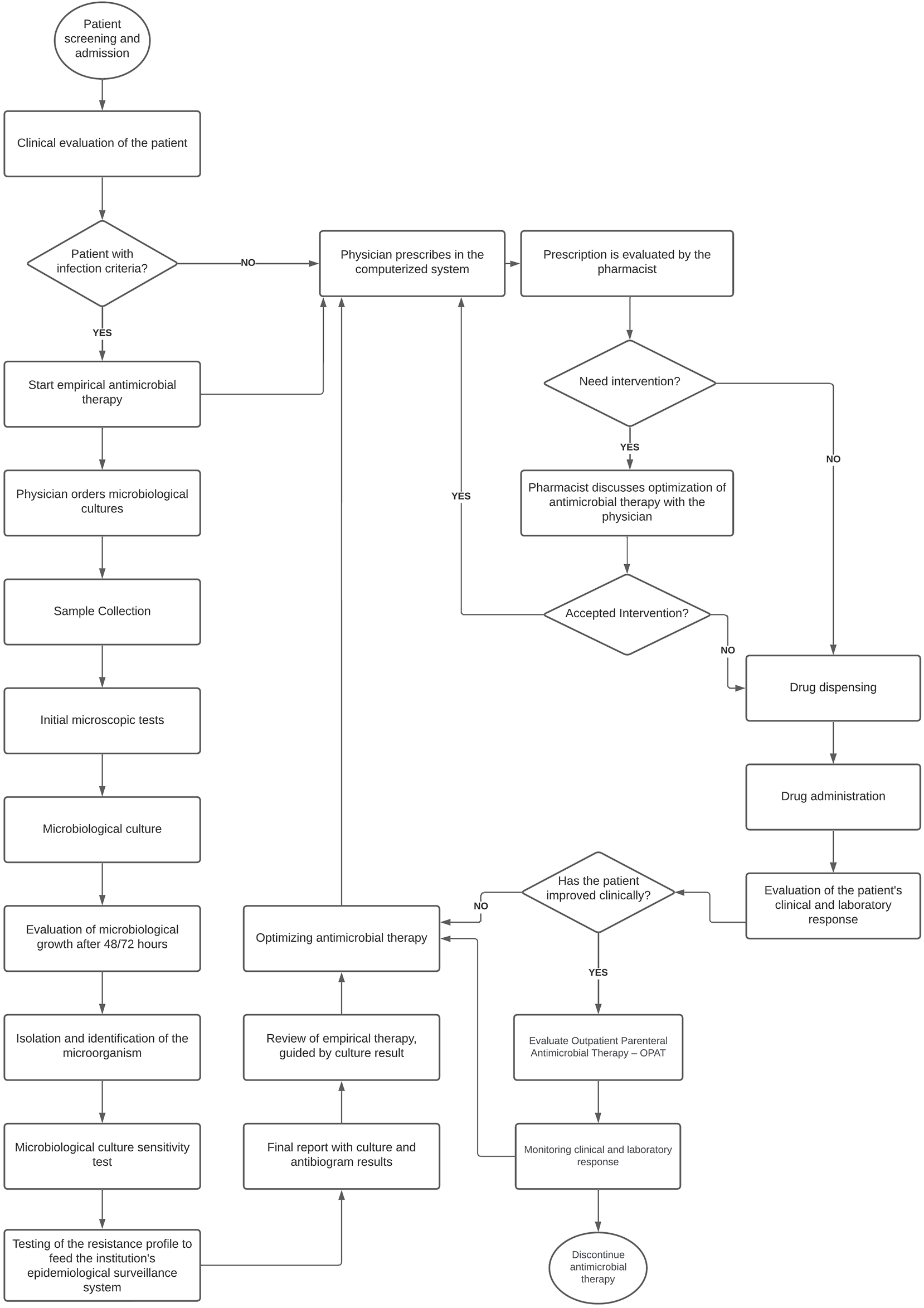 The HP received investments in human resources increasing the number of pharmacists from nine in 2016 to 15 in 2021, and the total of other professionals in the HP from 82 in 2016 to 110 in 2021. Besides, HP activities were expanded in 2016 with the restructuring of clinical pharmacy. The service operated 24 h a day in a physical area distributed into a central pharmacy and six satellite units. Medication prescription was developed by using a Computerized Physician Order Entry (CPOE). Antimicrobials were dispensed according to medical prescription and the analysis of drug indication. The first dose of restricted use antimicrobials was released immediately after the prescription. Then, the pharmacist performed a detailed evaluation of the indication, safety, effectiveness and convenience to substantiate the decision for completing drug therapy. There was no referral pharmacist specifically assigned to the management of antimicrobials and the release of restricted use antimicrobials could be discussed with HICC by any professional on duty. Figure 2 shows the flowchart of antimicrobial use starting from the assessment of clinical condition and the decision for prescription of antimicrobials, or not, until the completing of antimicrobial therapy.