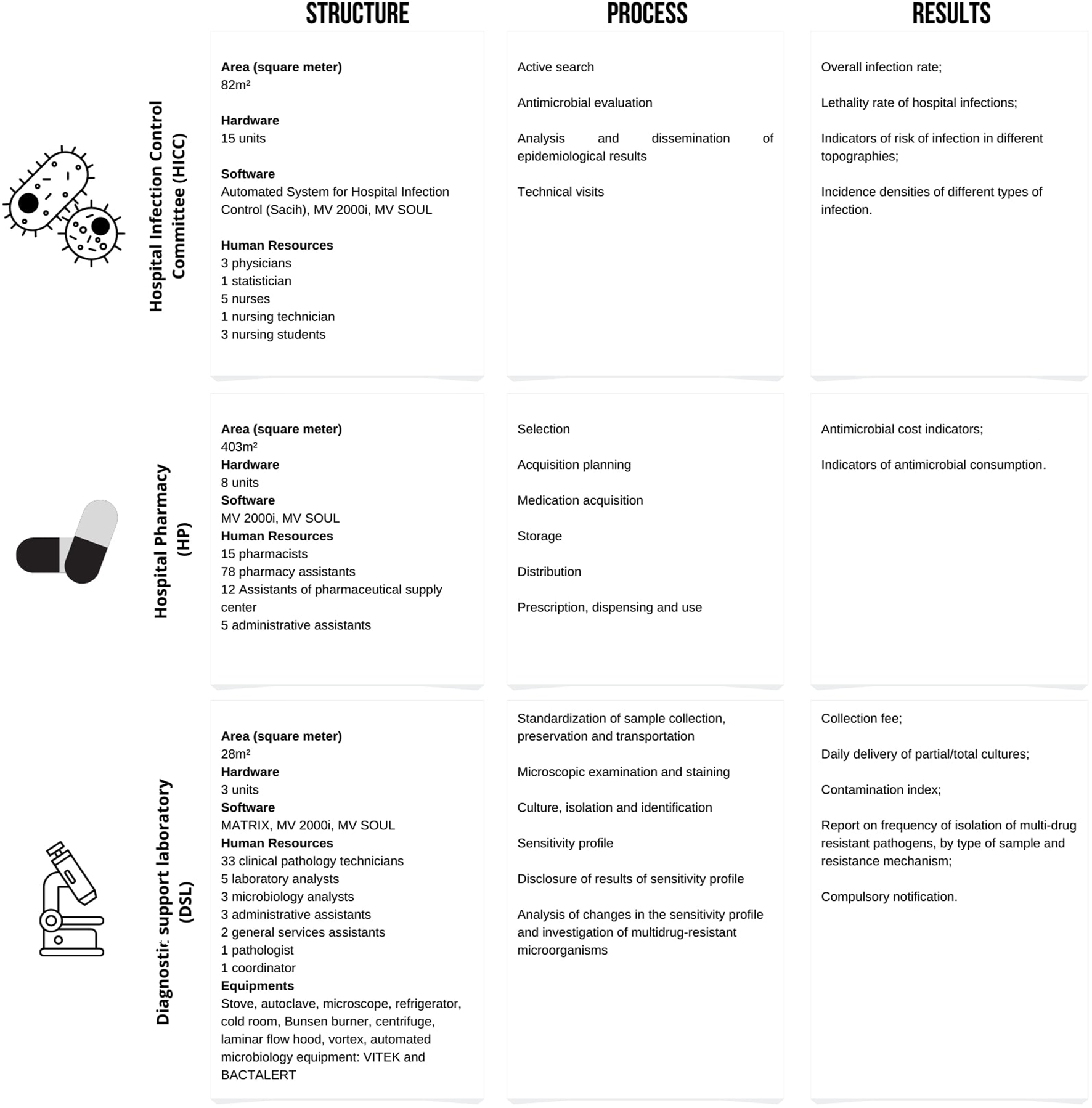 The ASP activities of the study hospital are guided by the hospital infection control committee (HICC), hospital pharmacy (HP) and diagnostic support laboratory (DSL). The description of the three main services involved in the ASP was based on a quality assessment model involving the dimensions of “structure”, “process” and “result”, according to the triad proposed by Donabedian (Donabedian, 1990) (Figure 1). The distribution among dimensions in the quality assessment was guided by the checklist of essential elements of the Hospital Antimicrobial Use Management Program, adapted by Anvisa from the Core Elements of Hospital Antibiotic Stewardship Programs proposed by the Center for Disease Control (CDC). Anvisa is responsible for infection control and monitoring drug usage in hospitals and community in Brazil (Brazilian Health Regulatory Agency, 2017b) (Figure 1). The checklist applied comprised eight sections with specific items with “yes/no” questions. The sections consist of: 1) support from the hospital senior management; 2) definition of responsibilities of professional teams; 3) educational activities; 4) actions to improve antimicrobial prescribing; 5) monitoring of the program; 6) results/outcomes; and 7) dissemination of results. For the purpose of the present study, the checklist was applied in July, 2022. A flowchart of the process of use of antimicrobials was also provided.
