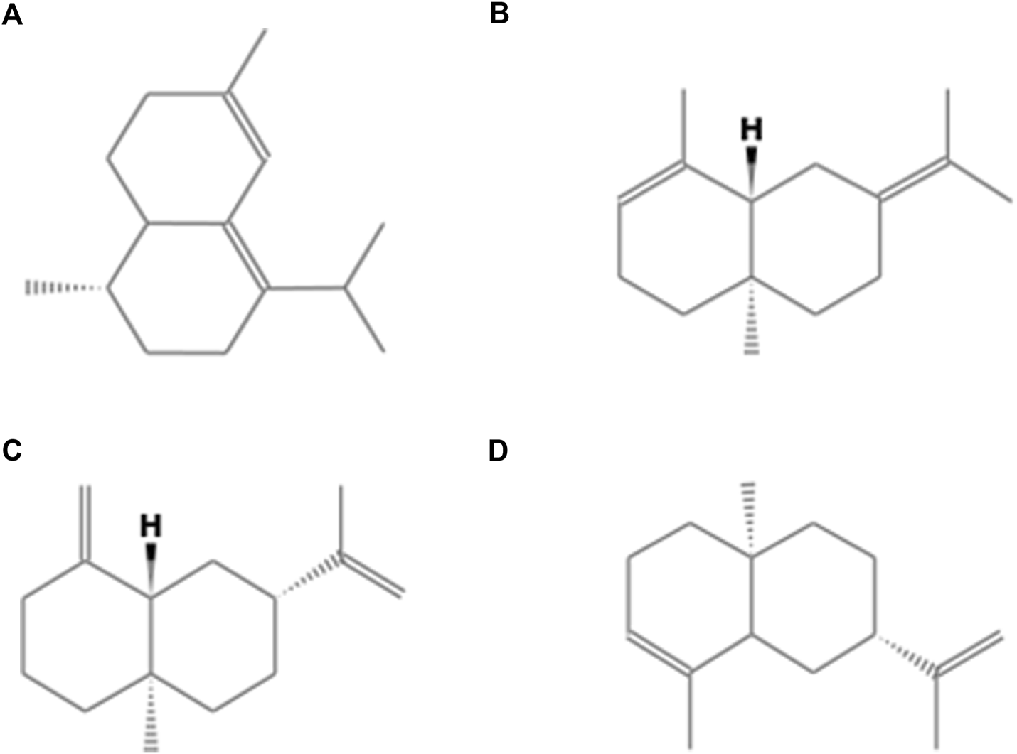 Chemical structures of major compounds from Neomitranthes obscura essential oil. (A) zonarene, (B) seline-3,7 (11)-diene, (C) β-selinene, and (D) α-selinene.