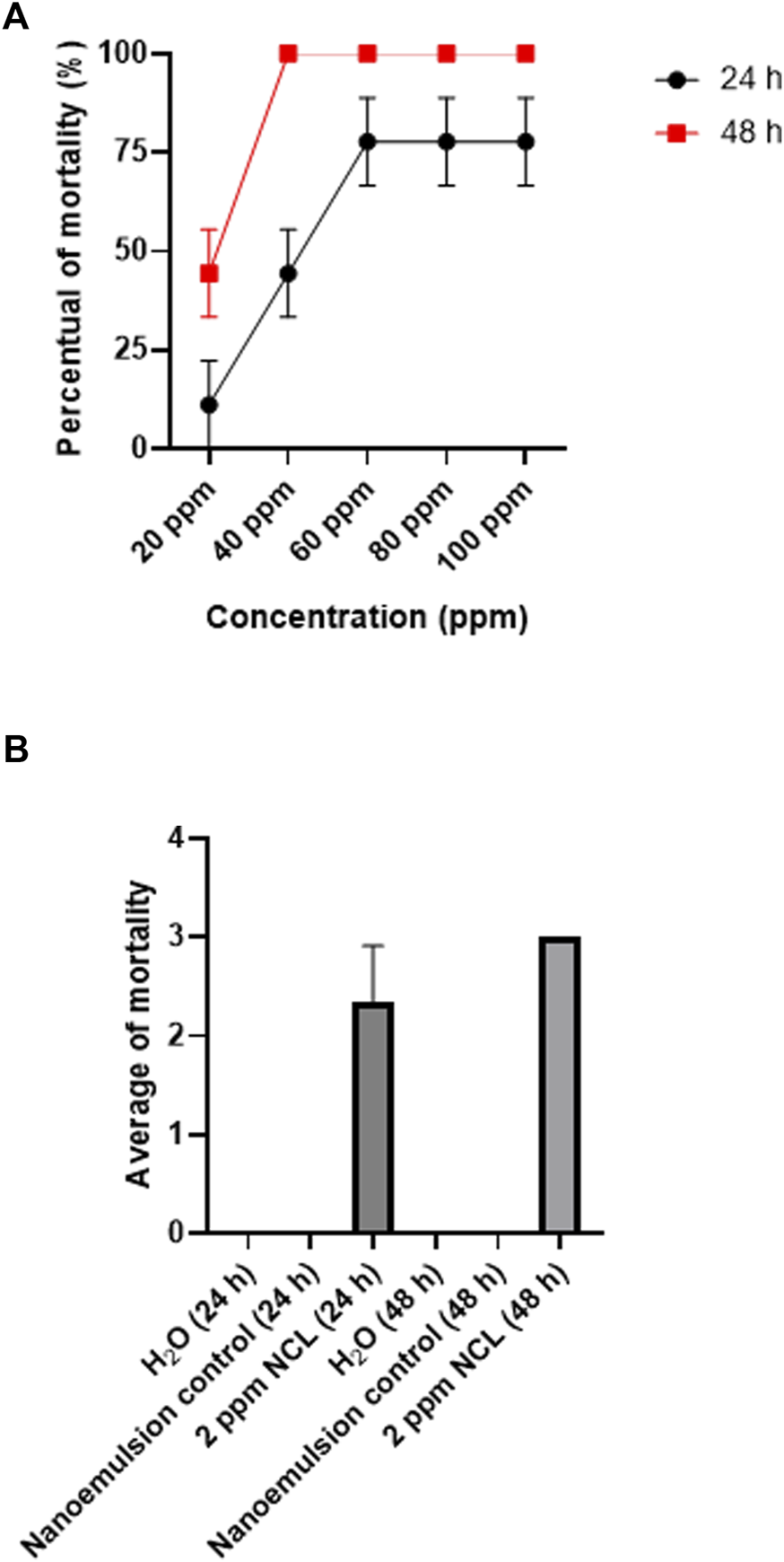 Molluskicide test on juvenile Biomphalaria glabrata for 48 h using NE (A,B). The test was performed in triplicate on different days using 27 specimens/triplicate. These data are expressed as the mean ± S.D. Linear regression analysis, R2: 0.8924, p-value: 0.0025.
