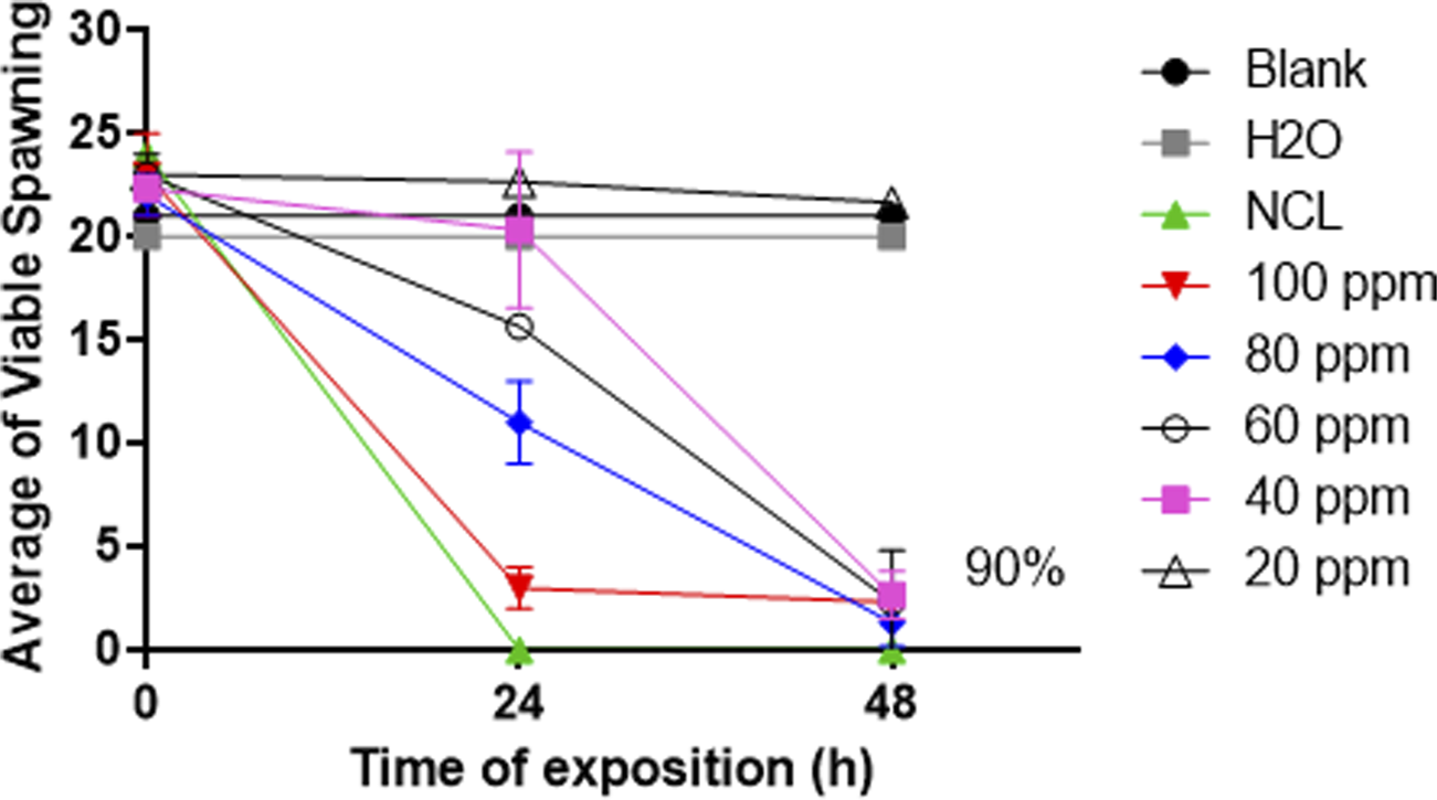The NE effect on the spawning viability of B. glabrata was tested in crescent concentrations for 24 and 48 h. After 48 h, the NE at 100 ppm presented a mortality rate higher than 90% of the viable eggs (Figures 4). The lethal concentrations obtained after 48 h were an LC50 of 30.3 ppm and an LC90 of 66.25 ppm.