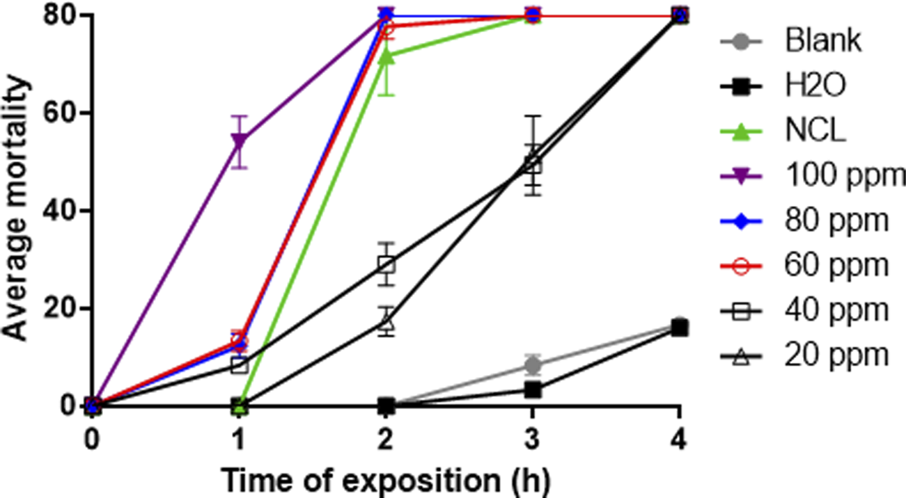 In 24-well plates, the amount of S. mansoni cercariae present in 1 mL was initially estimated using 20 μL of Lugol’s and counted under a stereomicroscope, where we obtain an average of 80 cercariae per plate well for these assays. Then, in another well of the plate, 1 mL of the suspension of S. mansoni cercariae and 1 mL of NE were added at concentrations of 20–120 ppm. Then, 20 μL of 0.1% Trypan Blue dye was added. The counting of dead cercariae, stained blue, was performed from 1 to 4 h.