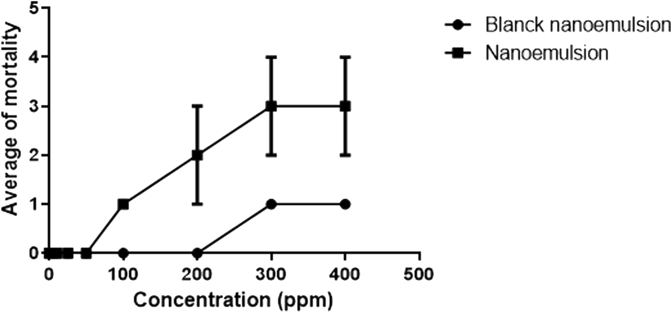Lethal concentration of the Neomitranthes obscura nanoemulsion in cercariae after 4 h.