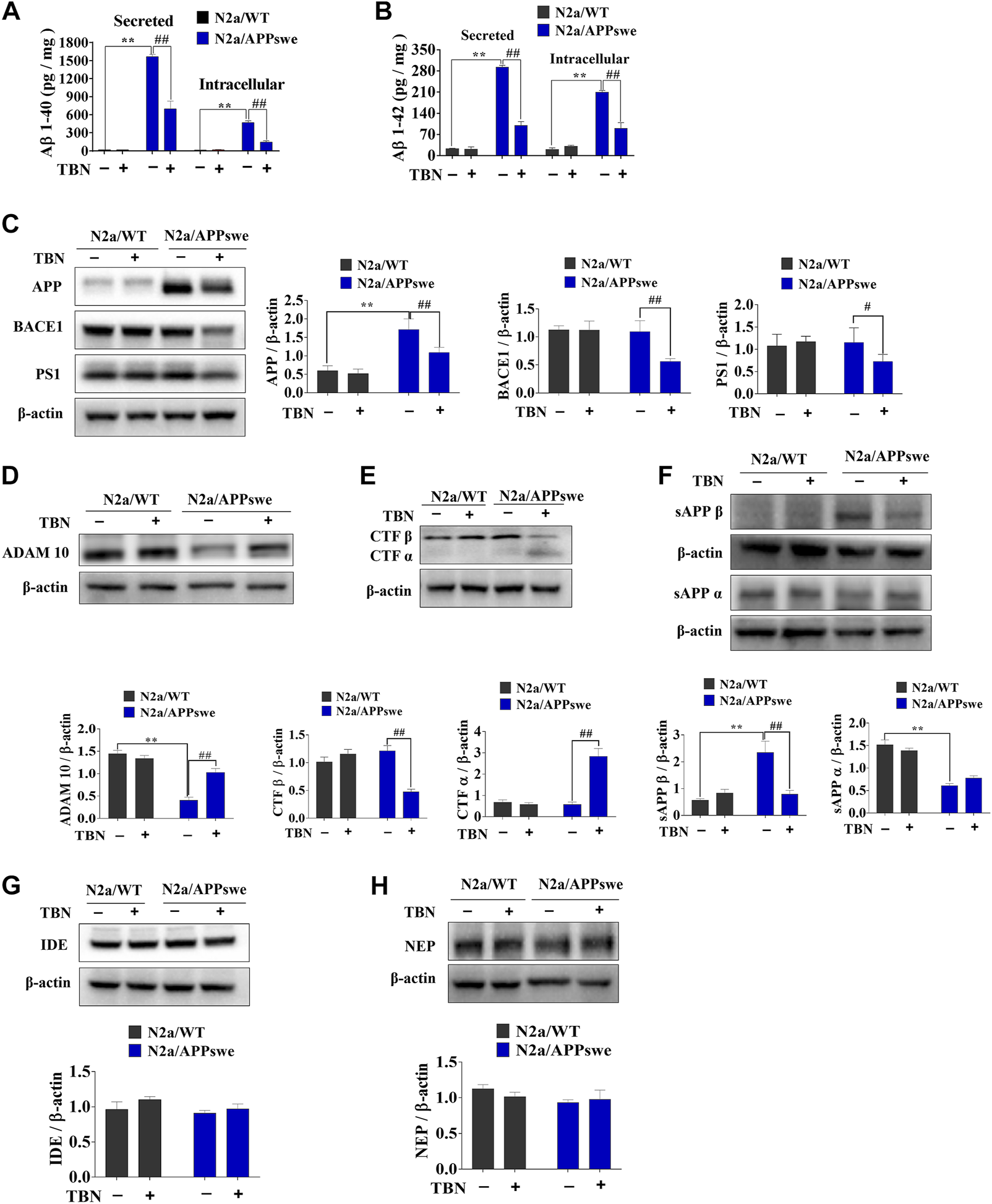 TBN treatment inhibits amyloidogenic APP processing and promotes nonamyloidgenic APP processing in N2a/APPswe cells. The cell culture medium or cell lysates were collected after 24 h treatment with TBN (300 μμM). (A B) The level of the secreted and intracellular Aβ40/42 in N2a/WT and N2a/APPswe cells were measured by enzyme-linked immunosorbent assay (ELIAS). (C) Representative Western blots of APP, BACE1, PS1 and ß-actin in the N2a/WT and N2a/APPswe treated with or without TBN. (D–F) Representative Western blots of ADAM 10, CTF α, CTFβ, sAPPα, sAPPβ and ß-actin in the N2a/WT and N2a/APPswe treated with or without TBN. (G,H) Representative Western blots of IDE and NEP and ß-actin in the N2a/WT and N2a/APPswe treated with or without TBN. Values represent mean ± SEM, n ≥ 3, **p <0.01 vs N2a/WT Ctrl, #p < 0.05 or ##p < 0.01 vs. N2a/APPswe Ctrl, two-way ANOVA.
