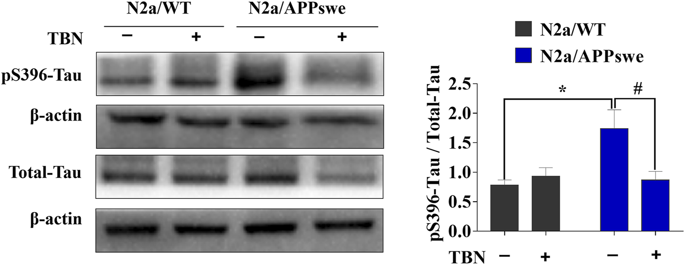 Next, we examined whether TBN could impact tau phosphorylation in N2a/APPswe by using antibodies against phosphorylated-tau at serine 396 (pS396) and total tau (Tau-5) analyzed by Western blot. As shown in Figure 2, elevated pS396-tau level was observed in N2a/APPswe, which was significantly reduced by TBN treatment. In addition, TBN also markedly reduced total tau level in N2a/APPswe but not in N2a/WT. Taken together, TBN effectively reversed the AD phenotype in N2a/APPswe cells.