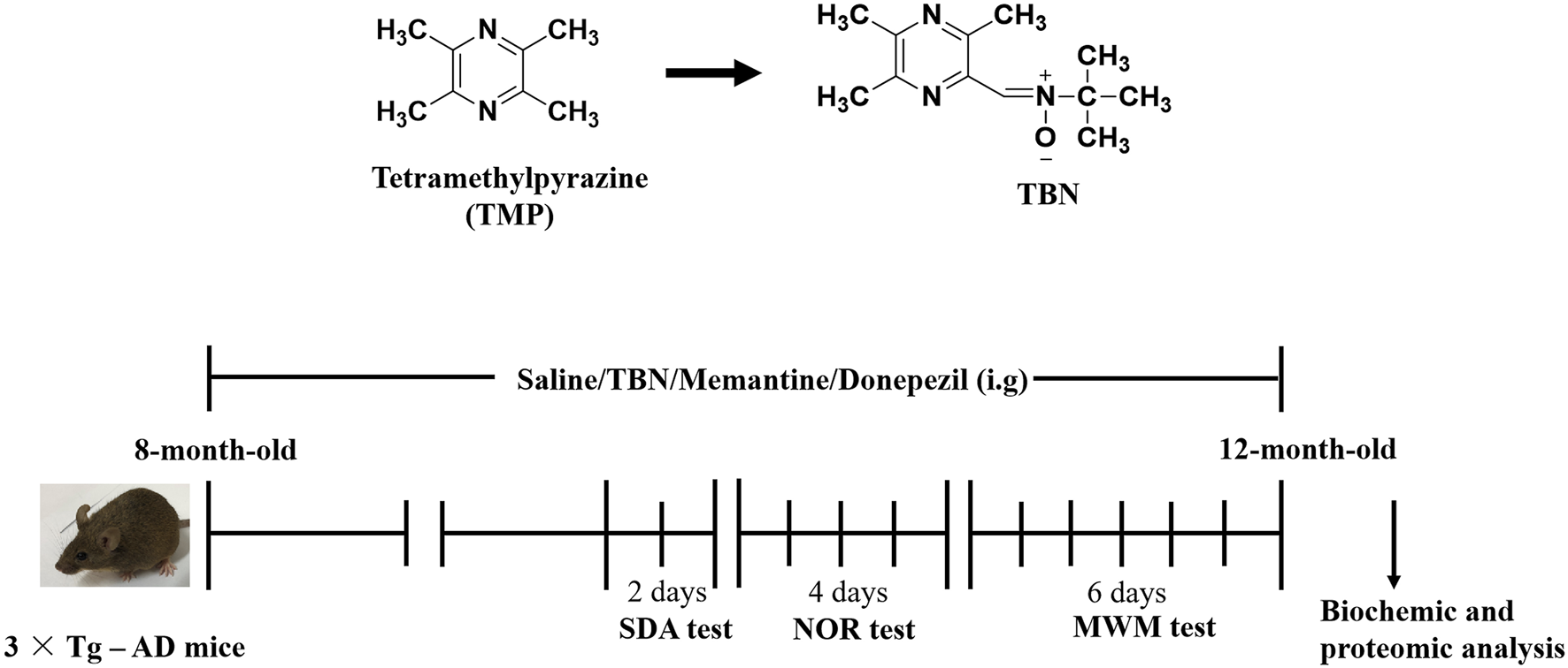 Chemical structures and experimental design for animal model. The chemical structures of TMP and TBN. The process design of TBN treatment study in 3×Tg-AD mice. SDA test: step-down avoidance (SDA) test. NOR test: novel object recognition (NOR) test. MWM test: morris water maze (MWM) test.