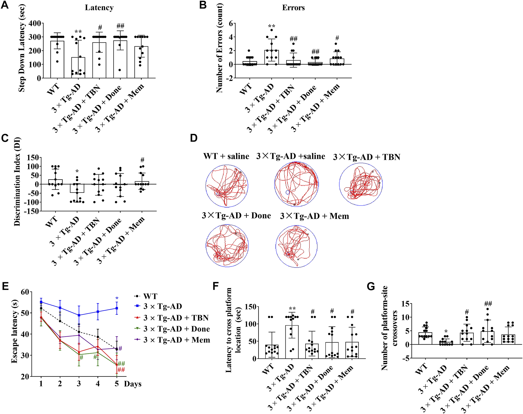 TBN improved cognitive capabilities of 3×Tg-AD mice. (A, B) TBN (60 mg/kg) significantly increased the step-down latency in memory retention test and decreased the number of errors made by 3×Tg-AD mice in SDA test. Donepezil and Memantine as the positive drugs. Done: Donepezil; Mem: Memantine. (C) TBN improved the recognition memory as shown by an increased discrimination index in 3×Tg-AD mice in NOR test. (D–G) TBN improved spatial memory and cognitive deficits of 3×Tg-AD mice in MWM test. (D) Representative swim traces of mice in the MWM after removing the platform during probe test. (E) Escape latency of mice to reach the platform during training (Day 1–5). (F) The latency of mice to cross from starting position to target quadrant during probe test. (G) Number of annulus crossing in target quadrant during probe test. Data were presented as mean ± SD, n ≥ 12, *p < 0.05 or **p < 0.01 vs. WT group, #p < 0.05 or ##p < 0.01 vs. 3×Tg-AD group, one-way ANOVA.