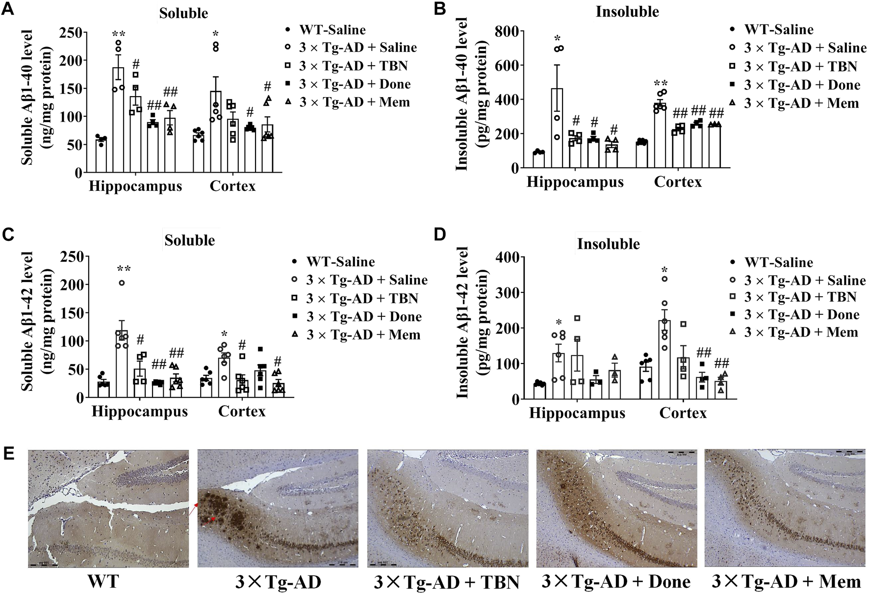 TBN treatment reduced the levels of Aβ in 3×Tg-AD mice. (A–D) Levels of soluble and insoluble Aβ40/Aβ42 in homogenates of hippocampal tissues and cerebral cortex of 3×Tg-AD mice or WT mice were determined by using ELISA. (E) Immunohistochemical staining by Aβ antibody (6E10) in the subiculum of hippocampal tissues. Data were presented as mean ± SEM, n ≥ 4, *p < 0.05 or **p < 0.01 vs. WT group, #p < 0.05 or ##p < 0.01 vs. AD group, two-way ANOVA.