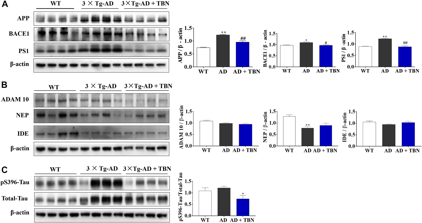 TBN treatment regulated APP processing and hyperphosphorylated tau in 3×Tg-AD mice. (A) Representative Western Blotting of APP, BACE1, PS1 and ß-actin in the hippocampal tissues of AD mice or WT mice. (B) Representative WB of ADAM10, NEP, IDE and ß-actin in the hippocampal tissues of AD mice or WT mice. (C) The levels of phosphorylated tau (pS396), total tau (Tau 5) and ß-actin were determined by Western blotting. Data were presented as mean ± SEM, n ≥ 4, *p < 0.05 or **p < 0.01 vs. WT group, #p < 0.05 or ##p < 0.01 vs. AD group, one-way ANOVA.