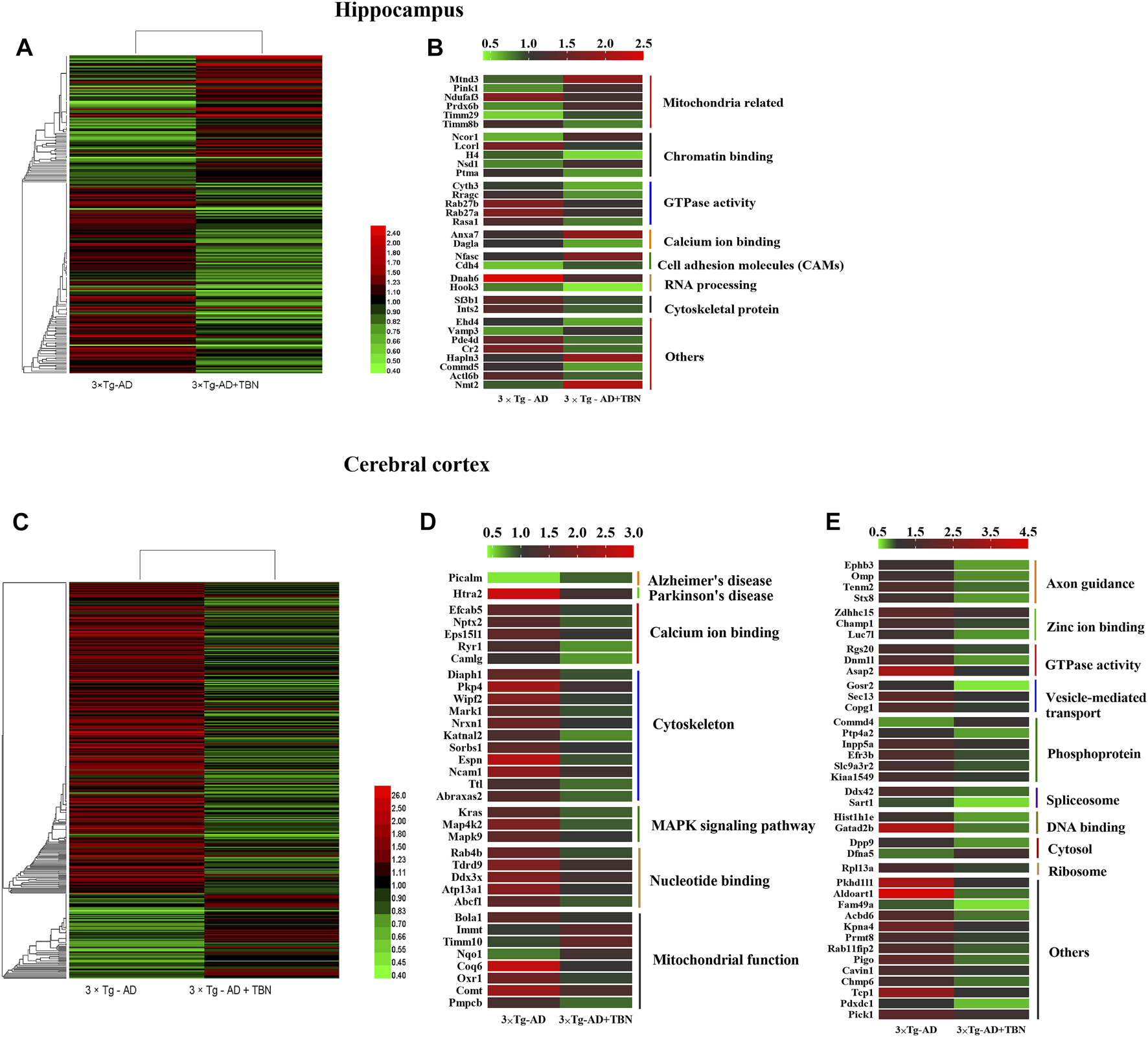 Heat mapping of altered proteins by TBN treatment in AD mice. (A) Hierarchical clustering of 210 changed proteins in the hippocampus between 3×Tg-AD group and TBN group. (B) 32 significantly altered proteins in the hippocampus related to mitochondrial, calcium ion binding, cytoskeleton and RNA processing between 3×Tg-AD group and TBN group. (C) Hierarchical clustering of 401 changed proteins in the cerebral cortex between 3×Tg-AD group and TBN group. (D,E) 74 significantly altered proteins in the cerebral cortex related to cytoskeleton, MAPK signaling pathway, mitochondrion function, axon guidance and DNA binding were identified between 3×Tg-AD group and TBN group. Color of each cell stand for degree of protein expression, red cell indicated rising level and green cell indicated reducing level compared with WT group. Heat mapping was performed by Heml 1.0.3.7-Heatmap Illustrator. Classification was performed by GraphPad Prism 7.0.
