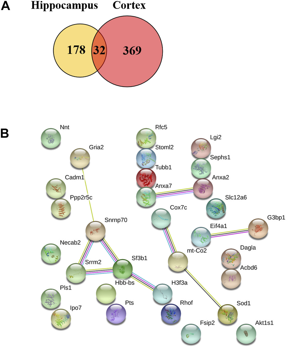 Venn diagram of two repeated analysis of the significant changed protein in the hippocampus and cerebral cortex. (A) The Venn diagram showing the overlap of differently expressed proteins after TBN treatment. (B) The PPI network of the 32 proteins.