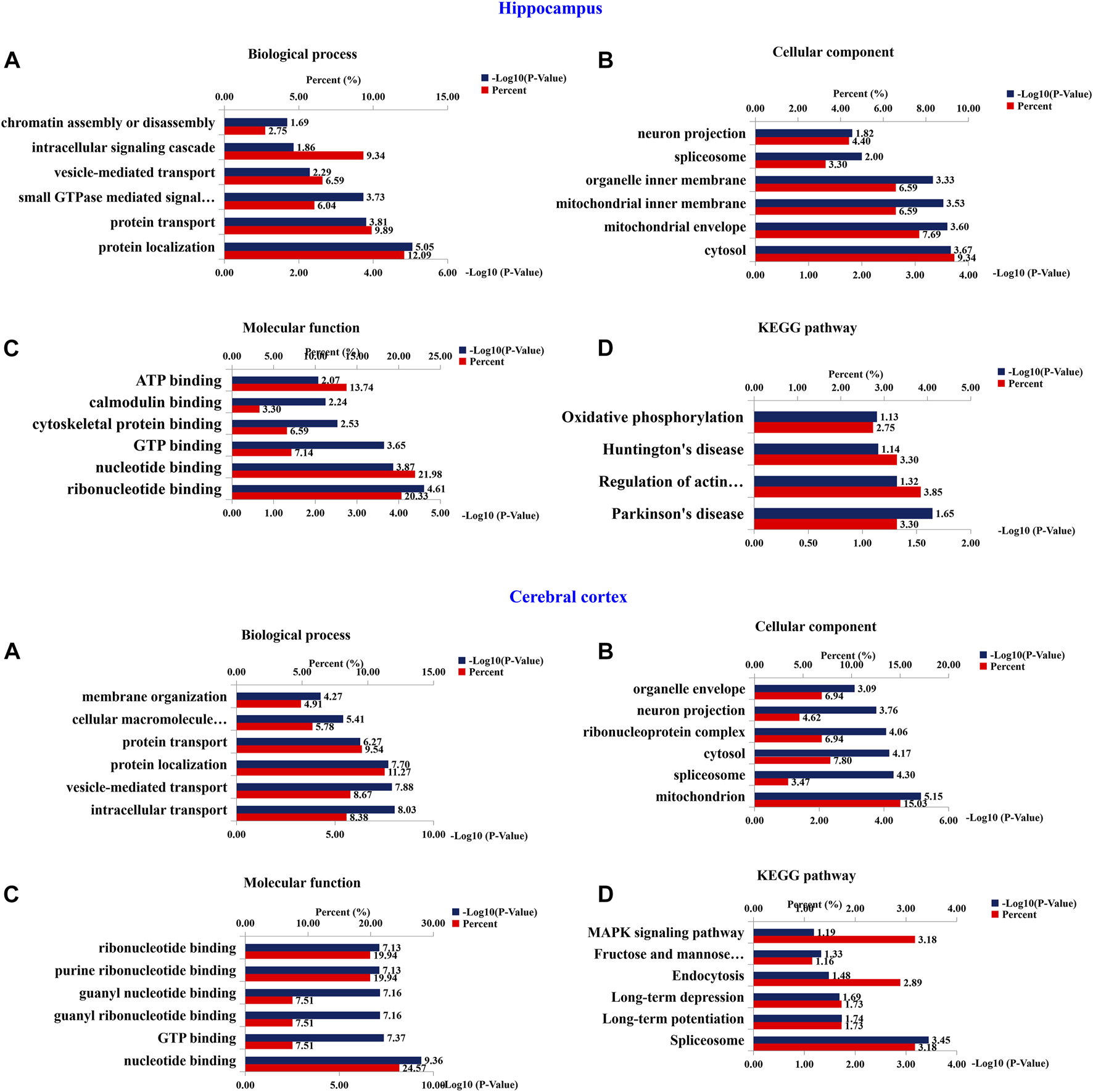 To investigate the functional significance of these altered proteins, functional classification (Gene Ontology terms) was performed by using DAVID bioinformatics resources (version 6.8). The results as shown in the Figure 10. The most representative terms of biological process in the hippocampus were protein localization, protein transport, vesicle-mediated transport and intracellular signaling cascade chromatin assembly or disassembly. Cytosol, mitochondrial envelope, mitochondrial inner membrane, organelle inner membrane, spliceosome and neuron projection were the most over-represented terms of cellular component in the hippocampal proteins. Ribonucleotide binding, nucleotide binding, GTP binding, cytoskeletal protein binding, calmodulin binding and ATP binding were the most enriched terms of molecular function were in the hippocampal proteins. In the cerebral cortical proteins, the most enriched terms of biological process were intracellular transport, vesicle-mediated transport, protein localization, protein transport, cellular macromolecule localization and establishment of membrane organization. The most representative terms of cellular component were mitochondrion, spliceosome, cytosol, ribonucleoprotein complex, organelle envelope, and neuron projection. The most enriched terms of molecular function were nucleotide binding, GTP binding, guanyl ribonucleotide binding, guanyl nucleotide binding, purine ribonucleotide binding and ribonucleotide binding. For hippocampal proteins, the highly represented terms of KEGG pathway included oxidative phosphorylation, Huntington’s disease, regulation of actin cytoskeleton and Parkinson’s disease. In the cerebral cortex, the highly enriched terms included MAPK signaling pathway, fructose and mannose metabolism, endocytosis, long-term depression, long-term potentiation and spliceosome.