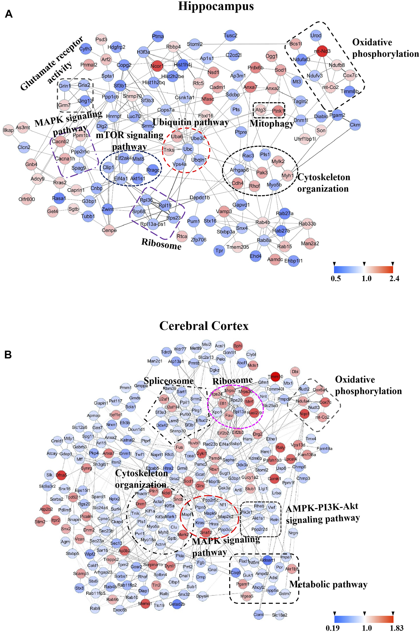 Protein-protein interaction (PPI) analysis of significantly changed proteins of hippocampus and cerebral cortex using STRING database and mapped by using Cytoscape 3.6.0. (A) PPI network of 210 differentially expressed proteins of hippocampus. (B) PPI network of 401 differentially expressed proteins of cerebral cortex. Circles indicate protein, gray lines indicate the interactions between two proteins, red node indicate upregulated proteins, and blue node indicate downregulated proteins.