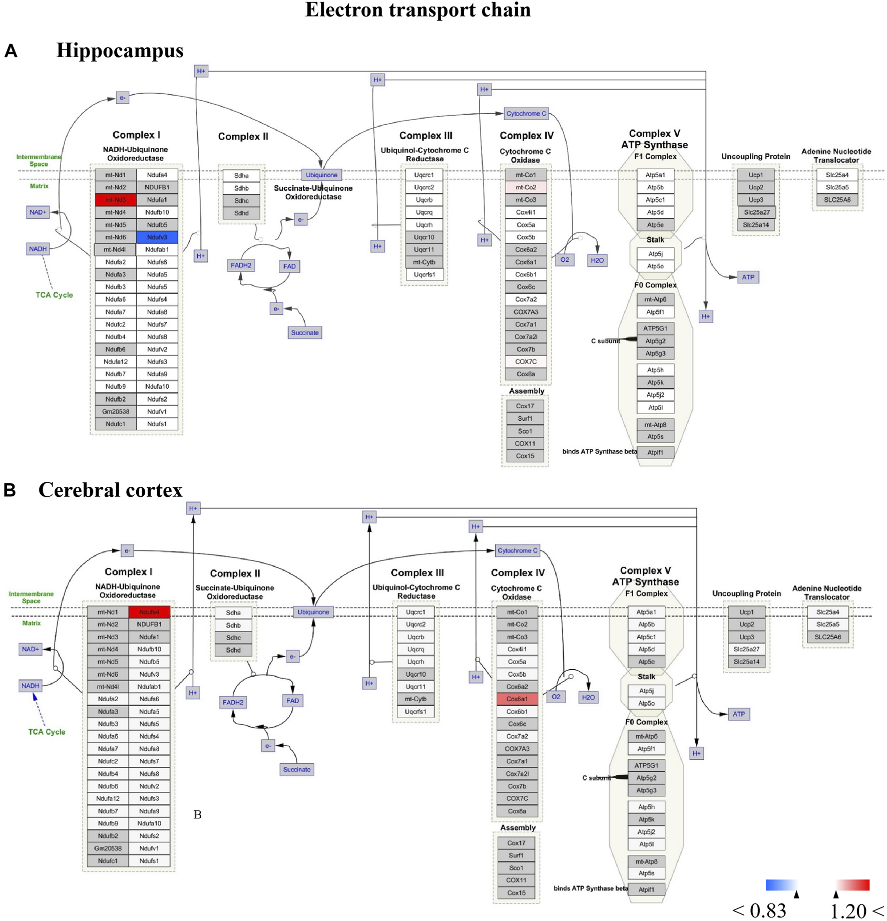 (A,B) All the identified proteins of hippocampus or cerebral cortex in the proteomics were imported into Cytoscape software to map electron transport chain based on the published database. The red boxes indicate up-regulated protein (ratio>1.2), blue boxes indicate down-regulated protein (ratio<0.83), white boxes indicate the indistinctively changed proteins and gray boxes stand for the unidentified proteins in this proteomic study.