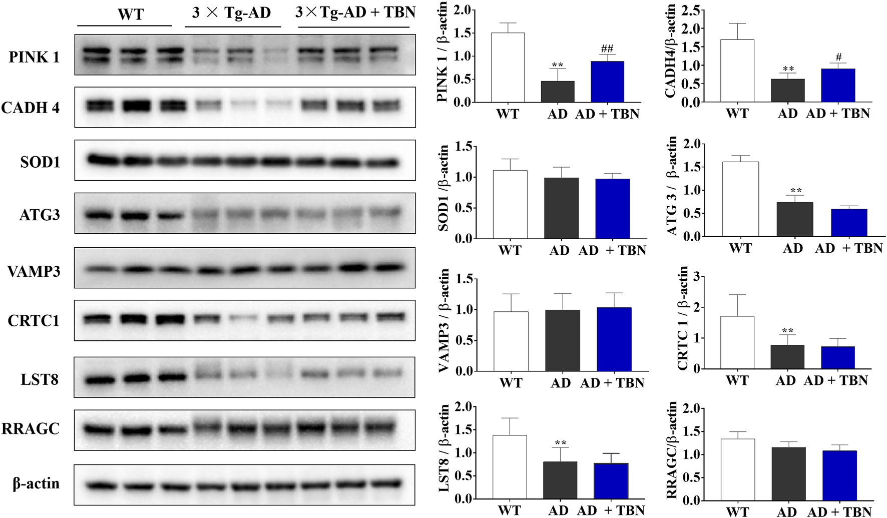 To further verify results from proteomic analysis, the samples of hippocampal tissues of 3×Tg-AD mice or WT mice was used to performed Western blot assays (Figure 14). Base on proteomic analysis, PINK1 (ratio: 1.62), CADH 4 (ratio: 1.53), VAMP3 (ratio: 1.51), SOD1 (ratio: 1.45), ATG3 (ratio: 1.26), Crtc1 (ratio: 1.2), LST8 (ratio: 0.75) and RRAGC (ratio: 0.64) were selected for further study (Table 1). As shown in Figure 14, the levels of PINK1 and CADH4 were significantly increased in TBN-treated group when compared with AD control group, which was consistent with the results of proteomic analysis that TBN significantly upregulated the expression of PINK1 and CADH4 (Table 1). However, the Western blot results of protein SOD1, ATG 3, VAMP 3, CRTC1, LST8 and RRAGC indicated that TBN had no effects on regulating their expression levels.