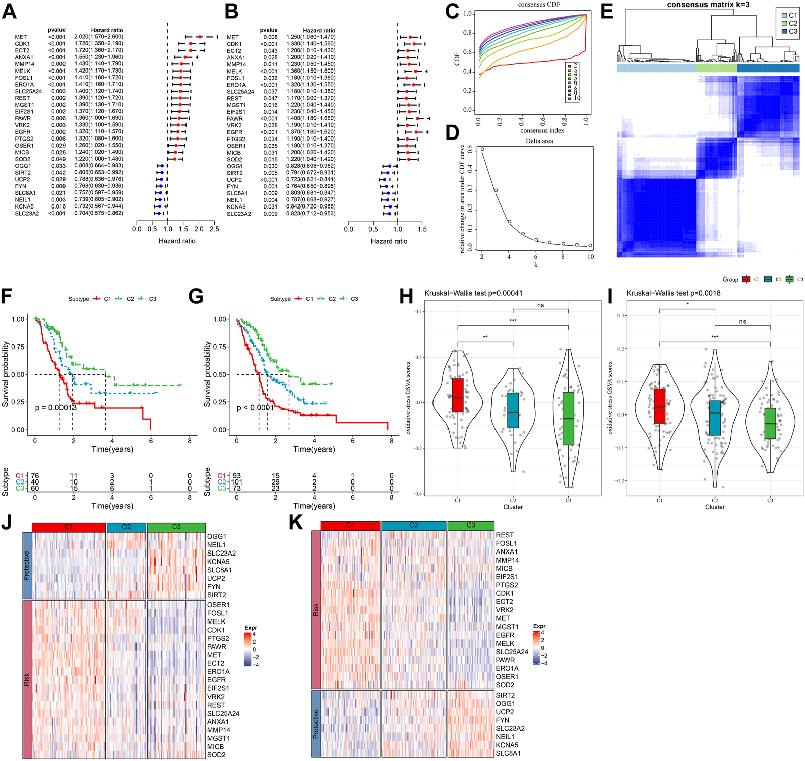 Three pancreatic cancer molecular subtypes based on oxidative stress-related genes. (A) In the TCGA-PAAD cohort, the forest plot of 27 prognostically significant oxidative stress genes; (B) The forest plot of 27 prognostically significant oxidative stress genes in the PACA-AU cohort; (C) CDF curves of TCGA-PAAD samples; (D) CDF Delta area curves of the samples, with the horizontal axis indicating the number of categories k and the vertical axis indicating the relative change in area under the CDF curve; (E) At consensus k = 3, the heat map of clustered samples; (F) KM curve of the prognosis of three subtypes of the TCGA-PAAD samples; (G) KM curve of the prognosis of three subtypes of the PACA-AU samples; (H) Differences in “oxidative stress ssGSEA scores” among the TCGA-PAAD molecular subtypes; (I)Differences in “oxidative stress ssGSEA scores” among the PACA-AU molecular subtypes; (J) Heat map of prognostic significant oxidative stress-related genes in TCGA-PAAD subtypes; (K) Heat map of prognostic significant oxidative stress-related genes in PACA-AU subtypes.
