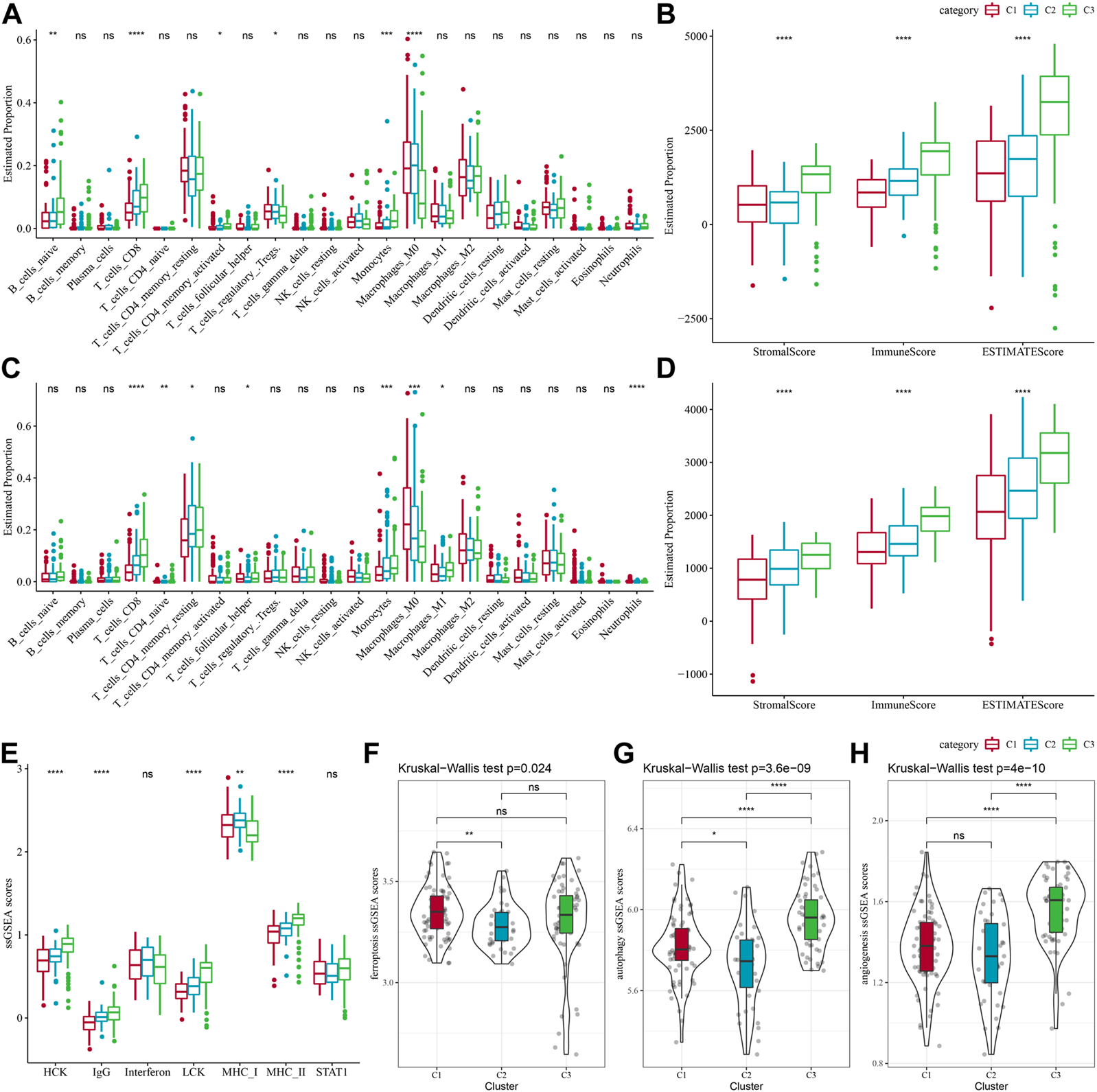Immune characteristics of different subtypes. (A) TCGA-PAAD molecular subtypes varied in the differences of 22 immune cell scores; (B) TCGA-PAAD molecular subtypes varied in the differences of ESTIMATE immune infiltration; (C) PACA-AU molecular subtypes varied in the differences of 22 immune cell scores; (D) PACA-AU molecular subtypes varied in the differences of ESTIMATE in immune infiltration; (E) TCGA-PAAD molecular subtypes varied in the differences of scores of seven inflammation-related gene clusters; (F) TCGA-PAAD molecular subtypes varied in the differences of ferroptosis pathway; (G) TCGA-PAAD molecular subtypes varied in the differences in scores of autophagy pathway; (H) TCGA-PAAD molecular subtypes varied in the differences in scores of angiogenesis-related genes; *p < 0.05; **p < 0.01; ***p < 0.001; and ****p < 0.0001.