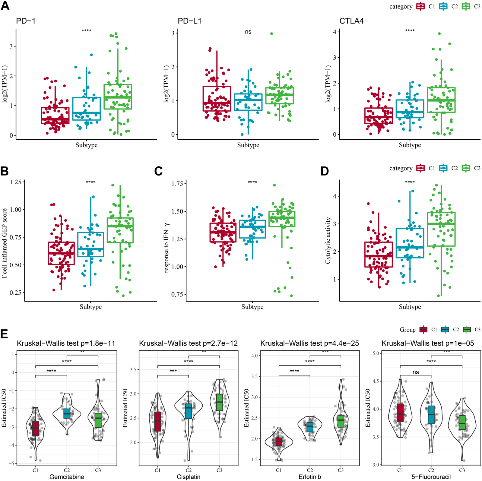 Differences in treatment sensitivity among the molecular subtypes. Among different molecular subtypes, (A) Differences in “T cell inflamed GEP score”; (B) differences in “response to IFN-γ”; (C) Differences in “response to IFN-γ". (B) Differences in “response to IFN-γ”; (C) Differences in immune checkpoint gene expression; (D) Differences in “Cytolytic activity”; (E) Box plots of IC50 of cisplatin, gemcitabine, 5-fluorouracil, erlotinib in TCGA-PAAD; *p < 0.05; **p < 0.01; ***p < 0.001; and ****p < 0.0001.