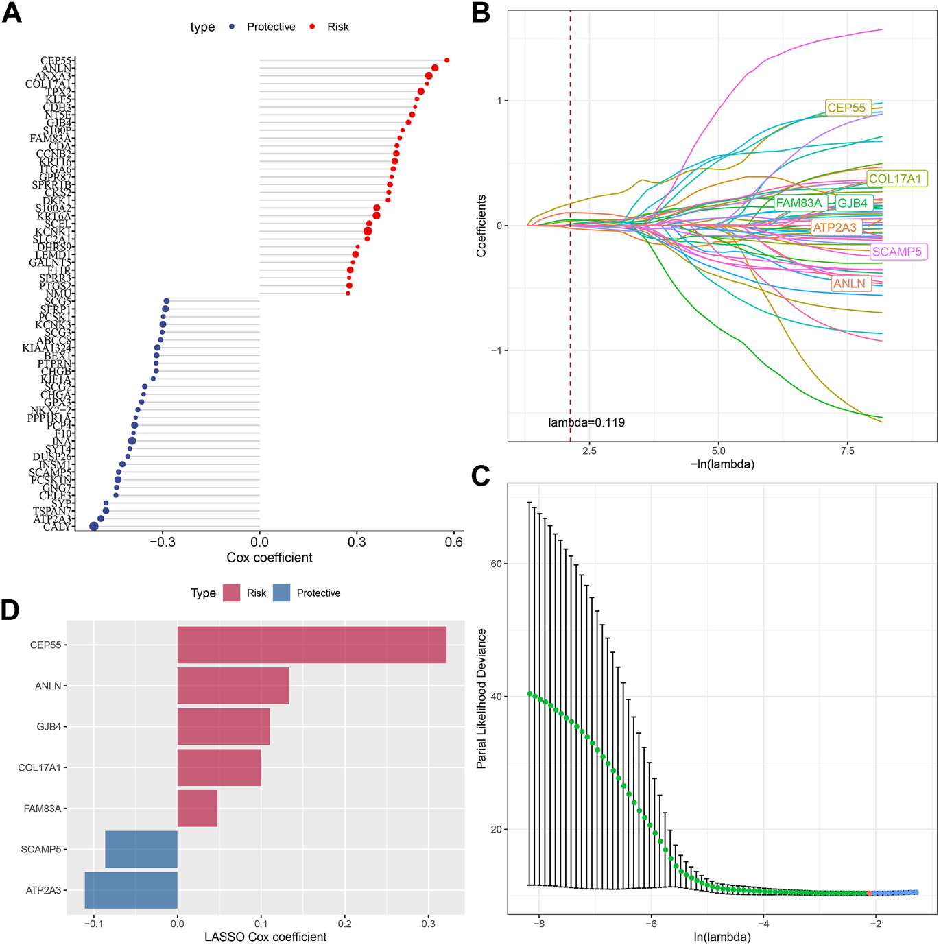 Next, we performed univariate COX regression analysis on 144 DEGs among the subtypes and identified 61 genes showing great prognostic significance (p < 0.01), including 31“Risk” and 30“Protective” genes (Figure 5A). PPI network analysis indicated that these genes are related to each other (Supplementary Figure S2). To further compress these 61 genes in the risk model, Lasso regression was used. Independent variable’s trajectory is shown in Figure 5B. The number of independent variable coefficients close to zero likewise showed a progressive increase as the lambda gradually increased. Moreover, 10-fold cross-validation was applied to develop a model and to analyze confidence intervals under each lambda (Figure 5C). When lambda = 0.119, the model was optimized, therefore, 7 genes at lambda = 0.119 were determined in this study as the genes related to oxidative stress to affect patients prognosis (Figure 5D). These genes included ATP2A3, ANLN, GJB4, FAM83A, CEP55, COL17A1, and SCAMP5. The formula as followed: RiskScore = + 0.134*ANLN-0.086*SCAMP5+0.048*FAM83A-0.111*ATP2A3+0.322*CEP55 + 0.11*GJB4+0.1*COL17A1 Single-cell division TISCH2 (http://tisch.comp-genomics.org/home/) analyzed the expression distribution of seven genes in multiple single-cell data of pancreatic cancer, and the results showed that the expression of COL17A1 and FAM83A genes in malignant cells was significantly higher than that in other cell types (Supplementary Figure S3).