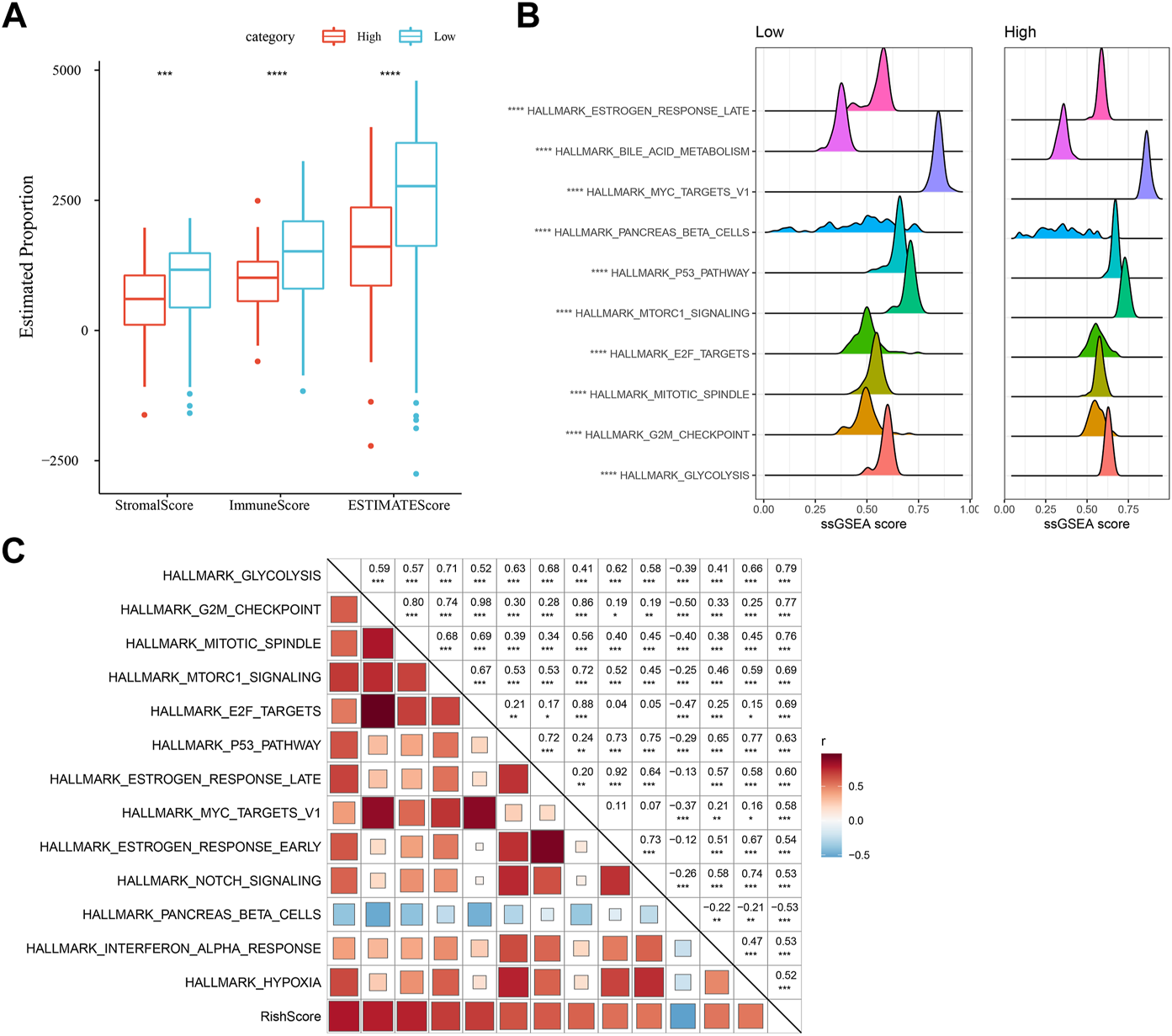Immunology and pathway between different RiskScore subgroups. (A) ESTIMATE software was applied to determine immune cell components in the TCGA database; (B) The top 10 pathways showing the greatest significant differences between Low-risk and high-risk groups; (C) Correlation analysis results on the RiskScore and KEGG pathways scored greater than 0.5; *p < 0.05; **p < 0.01; * **p < 0.001; and ****p < 0.0001.