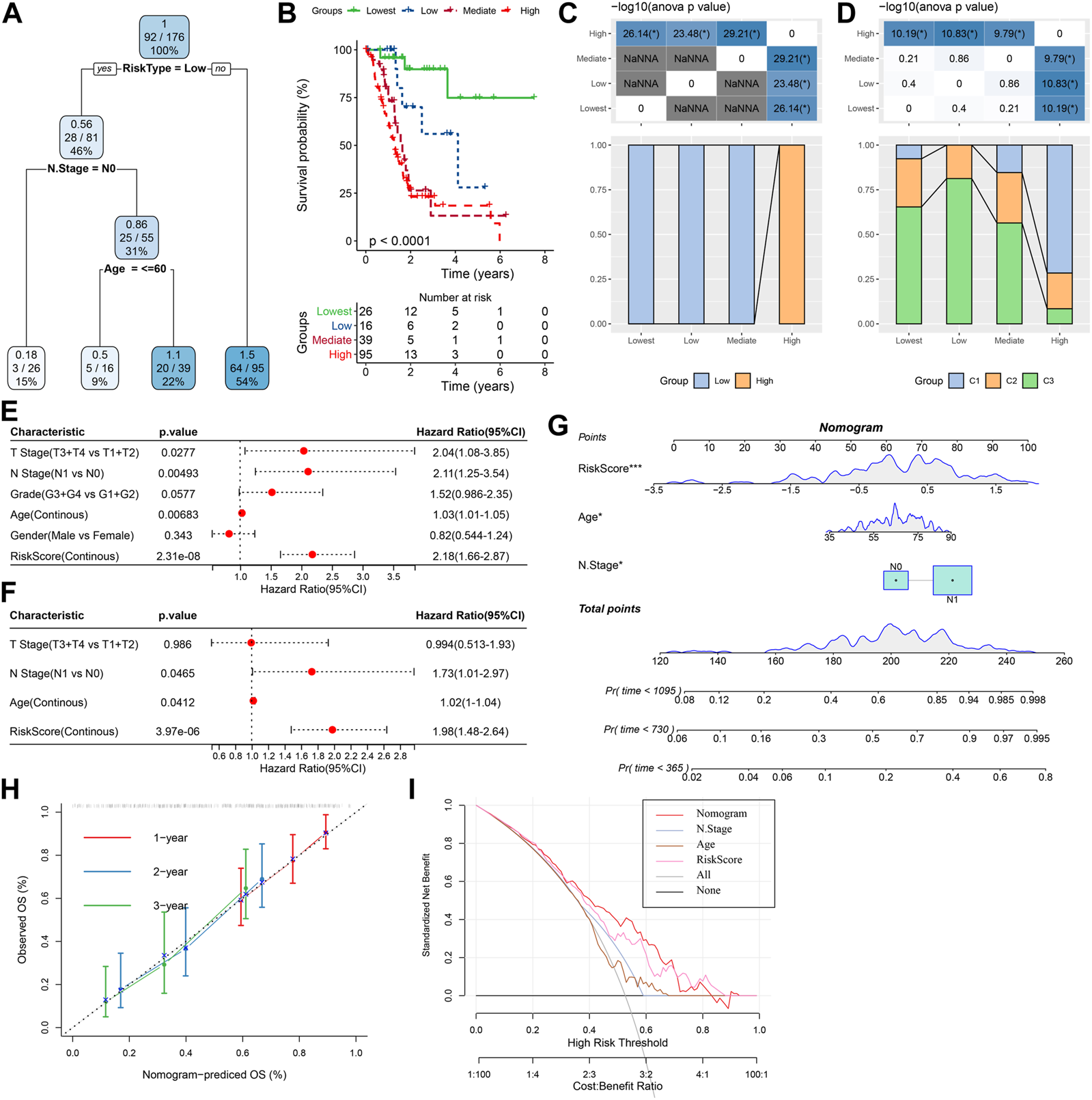 The nomogram of prognostic risk models with clinicopathological features. (A) To optimize risk stratification, patients with full-scale annotations including TNM Stage, age, gender, and RiskScore were enrolled for developing a survival decision tree; (B) Risk subgroups showed significant overall survival differences; (C, D) Comparative analysis between different subgroups; (E, F) RiskScore and clinicopathological (E, F) Univariate and multifactorial Cox analysis on clinicopathological features and RiskScore; (G) The nomogram model; (H) Calibration curves for 1, 3, and 5 years (s) of the nomogram; (H:Decision curve for the columnar graph; (I) The most powerful capacity of the nomogram for survival prediction when compared with other clinicopathological features. *p < 0.05; **p < 0.01; ***p < 0.001; and ****p < 0.0001.