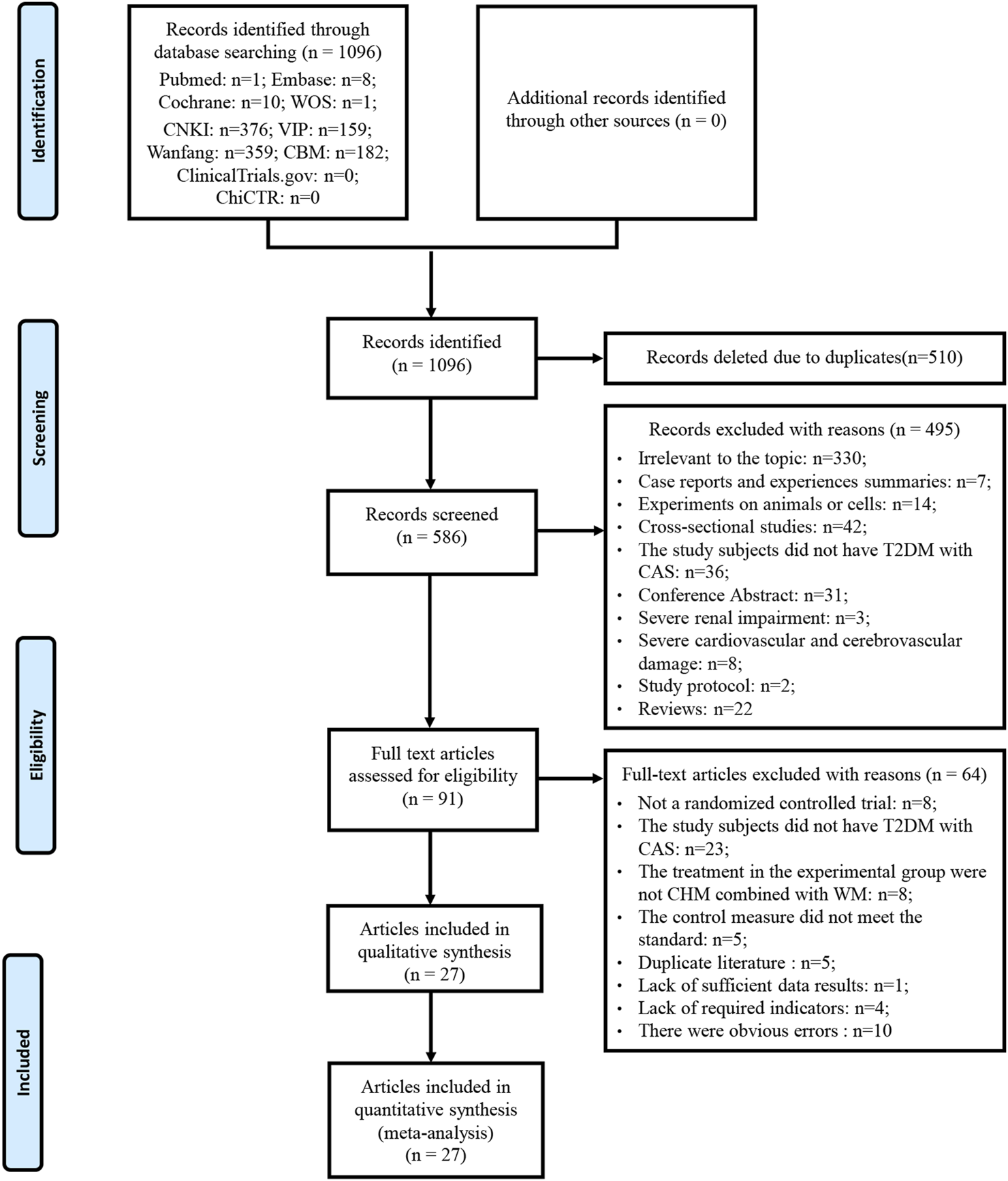 A total of 1096 articles were obtained by searching PubMed, EMBASE, Cochrane Library, WOS, CNKI, Wan Fang Database, VIP and the CBM. Five hundred and ten articles were removed due to duplication. Of the remaining 586 articles, 495 articles were excluded after reading titles and abstracts. By reading the full text of the remaining 91 articles, 64 articles were excluded according to the inclusion and exclusion criteria. No additional studies were identified by screening references of relevant reviews and meta-analyses. A total of 27 studies were included after removing duplicates published by the same study. Literature excluded after reading the full text and reasons is listed in Supplementary Material S3. A detailed flowchart for screening eligible studies is shown in Figure 1.