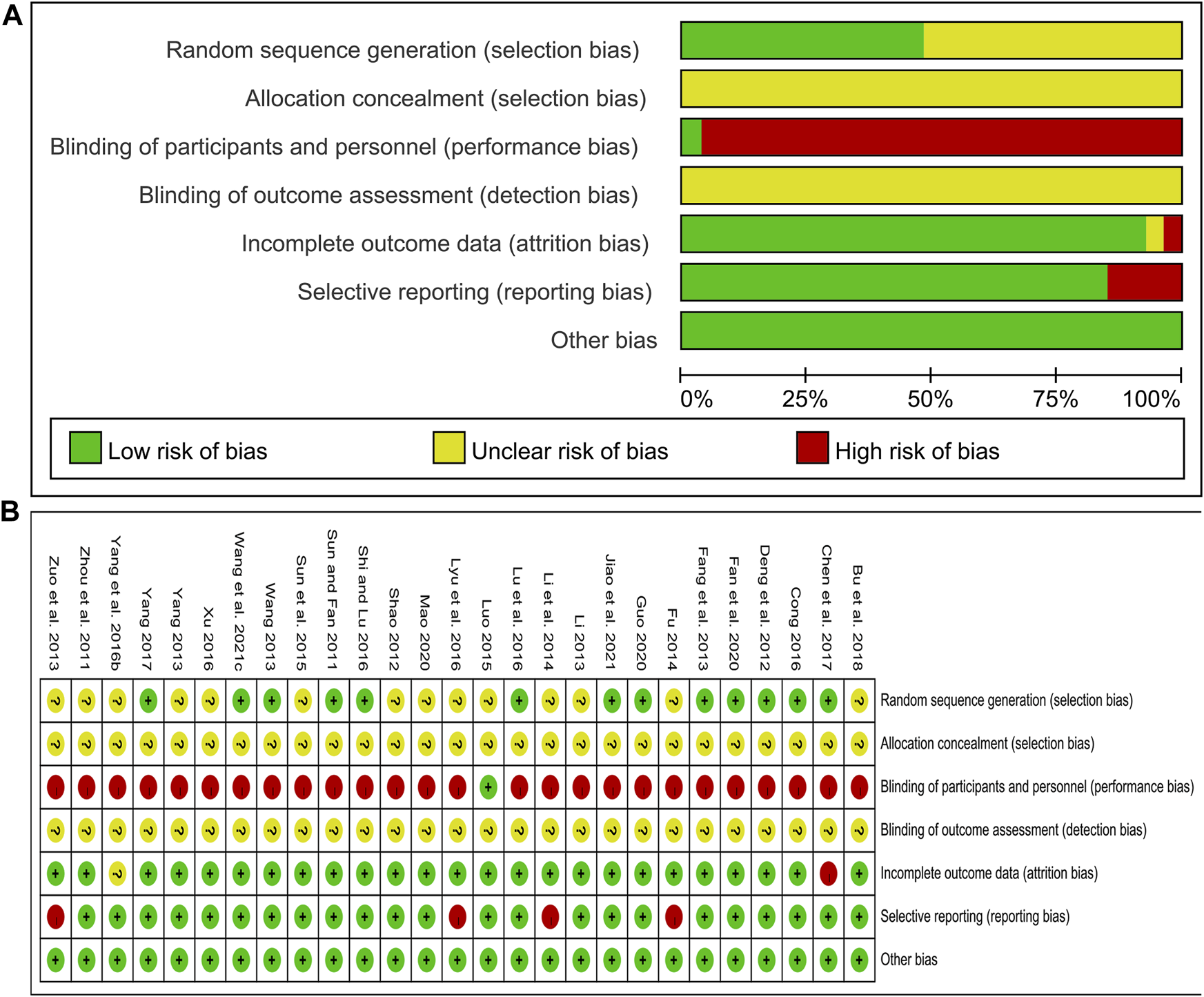 The quality of the literature was assessed using the bias risk assessment tool in Review Manager 5.4. The assessment content consists of seven domains, including random sequence generation, allocation concealment, blinding of participants and personnel, blinding of outcome assessment, incomplete outcome data, selective reporting and other bias. The bias risk assessment was carried out for each included study from these seven domains. The judgment of each domain was divided into “high risk”, “low risk” and “unclear risk”. ZZ and YL performed independently and examined each other. If there were different opinions on the evaluation results, it was determined after discussion or consultation with XF.