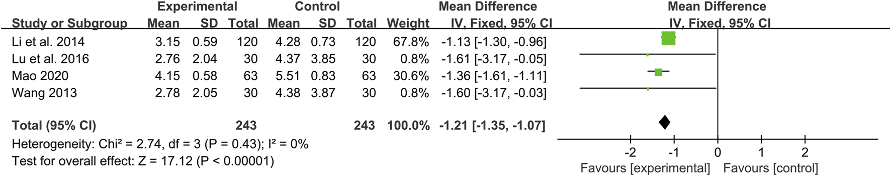 Four studies including 486 patients evaluated the effectiveness of CHM plus WM with WM alone (Wang, 2013; Li et al., 2014; Lu et al., 2016; Mao, 2020). According to the heterogeneity test (p = 0.43, I2 = 0%), a fixed effect model was selected for statistical analysis. The result showed that combined with CHM could significantly reduce Crouse score, and the difference was statistically significant (MD = −1.21, 95%CI: −1.35 to −1.07, p < 0.01) (Figure 5). Subgroup analyses according to average age, treatment duration and dosage form were performed to explore the effect of these factors on the result. The results showed that combination treatment could reduce the Crouse score in T2DM patients with CAS of different average age, treatment duration and dosage form (Supplementary Material S6). Sensitivity analysis showed that the pooled effect sizes were similar and the result was relatively stable (Figure 4B, Supplementary Material S5).