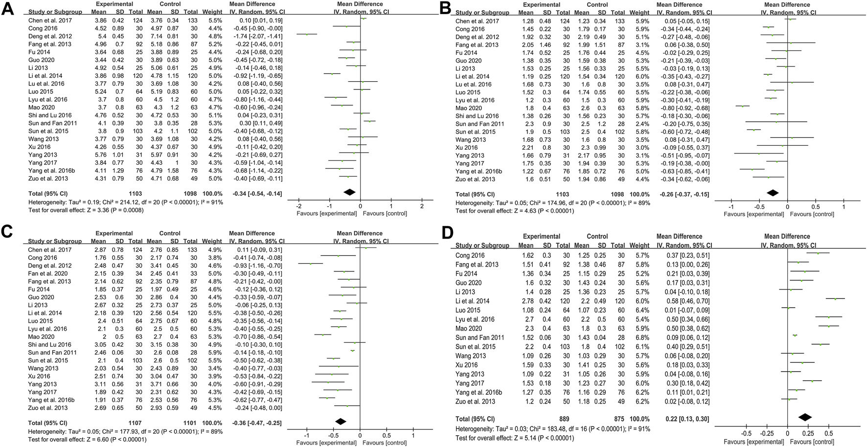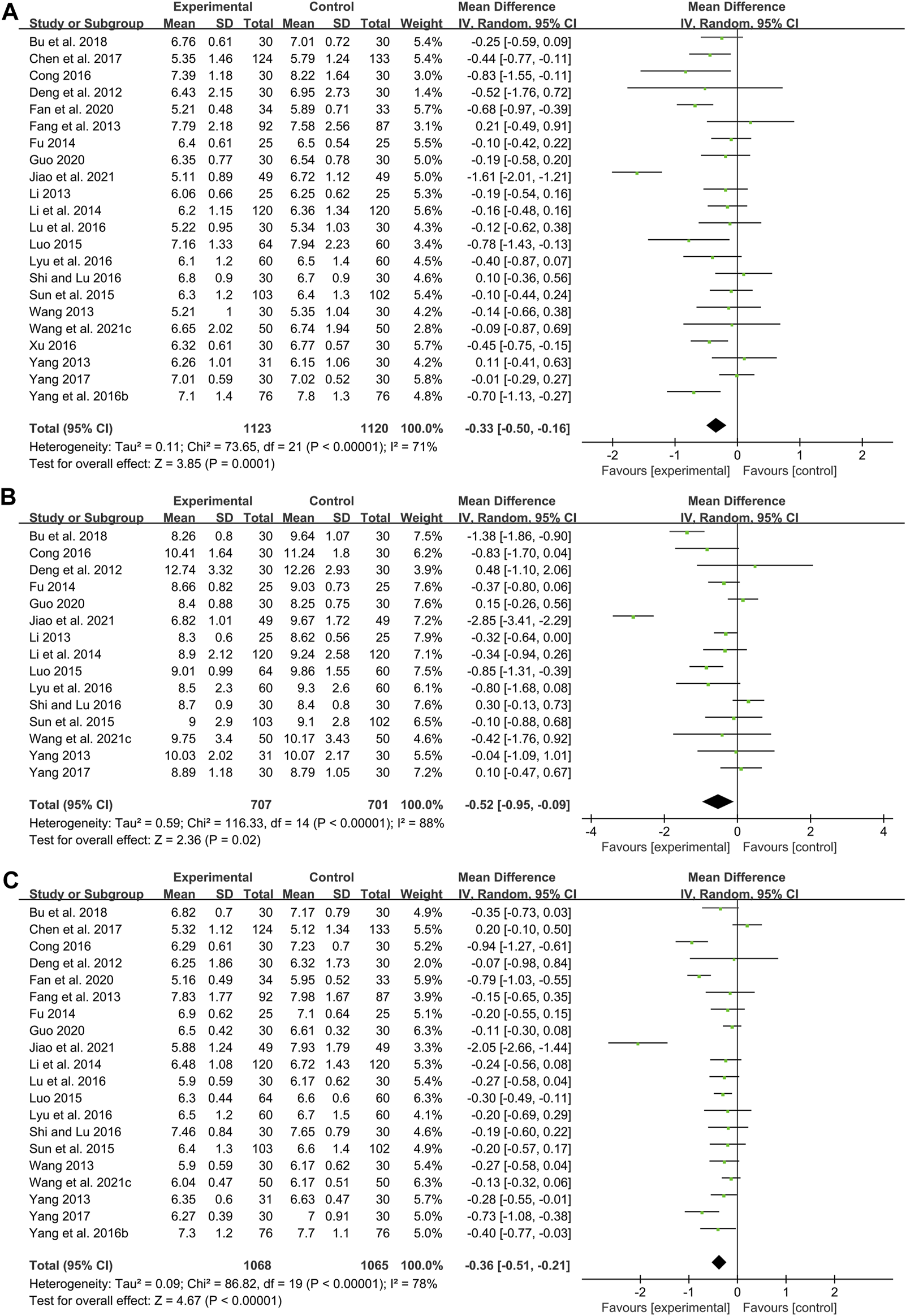 Twenty-one studies including 2201 patients compared CHM plus WM with WM (Sun and Fan, 2011; Deng et al., 2012; Fang et al., 2013; Li, 2013; Wang, 2013; Yang, 2013; Zuo et al., 2013; Fu, 2014; Li et al., 2014; Luo, 2015; Sun et al., 2015; Yang et al., 2016b; Cong, 2016; Lu et al., 2016; Lyu et al., 2016; Shi and Lu, 2016; Xu, 2016; Chen et al., 2017; Yang, 2017; Guo, 2020; Mao, 2020). According to the heterogeneity test (p < 0.01, I2 = 91%), a random effect model was selected for statistical analysis. The pooled result showed that when compared with WM, the combination with CHM could significantly reduce the TC level (MD = −0.34 mmol/L, 95%CI: −0.54 to −0.14, p < 0.01) (Figure 6A). Meta-regression was performed to explore possible sources of heterogeneity. In general, the average age (p = 0.922, Adj R2 = −5.70%), the treatment duration (p = 0.342, Adj R2 = −0.26%) and the dosage form (p = 0.466, Adj R2 = −2.42%) were not the sources of heterogeneity for the TC (Supplementary Material S4). Sensitivity analysis showed that the pooled effect sizes were similar and the result was robust (Figure 4C; Supplementary Material S5).
