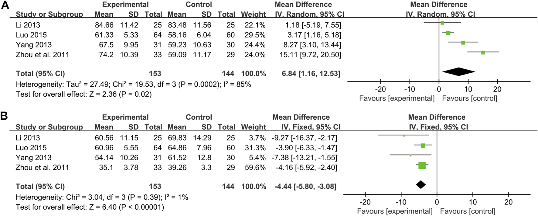 Four studies including 297 patients evaluated the effectiveness of CHM plus WM to WM on NO (Zhou et al., 2011; Li, 2013; Yang, 2013; Luo, 2015). According to the heterogeneity test (p < 0.01, I2 = 85%), a random effect model was used. The pooled result found statistical significance between combination treatment and WM in NO (MD = 6.84 μmol/L, 95%CI: 1.16 to 12.53, p = 0.02) (Figure 8A). Due to the small number of included studies, there were only 1 or two articles within each subgroup, which may lead to poor representation. So, subgroup analysis to explore sources of heterogeneity cannot be performed well. We speculated that the reason for the heterogeneity might be related to the different disease stages of the patients between studies, resulting in different impairment degrees of vascular endothelial function. This is partly responsible for differences in baseline levels and drug responsiveness between study points. Sensitivity analysis showed that Yang, 2013 was highly sensitive. After excluding it, the pooled result was reversed and no statistical significance (MD = 6.42 μmol/L, 95%CI: −1.27 to 14.11, p = 0.10) (Figure 4J, Supplementary Material S5), indicating that the result is not robust. Yang, 2013 had a partial weight in the pooled result due to its moderate sample size and small standard deviation. Therefore, we are more convinced of the pooled effect size involved in this study, considering that the improvement of NO with combination treatment may be better than that of WM alone. However, due to the small number of included studies and limited sample size, this finding is not fully conclusive and further high-quality studies are needed to confirm it.
