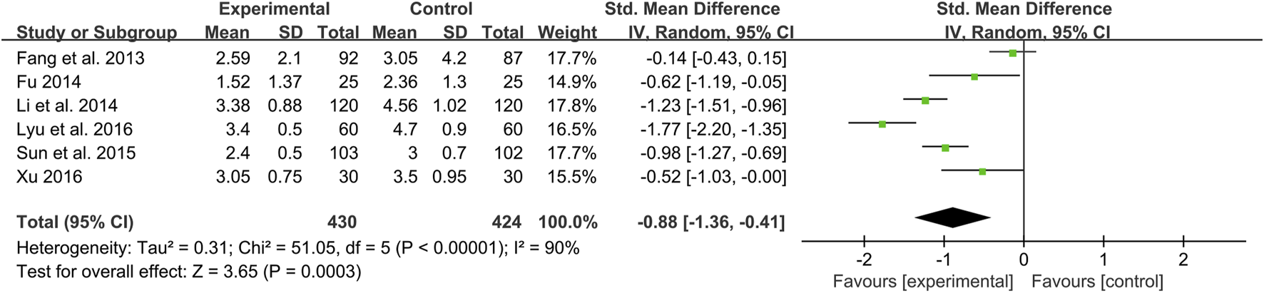 Six studies including 854 patients reported a comparison of HOMA-IR between combination treatment group and WM group (Fang et al., 2013; Fu, 2014; Li et al., 2014; Sun et al., 2015; Lyu et al., 2016; Xu, 2016). According to the heterogeneity test (p < 0.01, I2 = 90%), a random effect model was used. The pooled result illustrated that combination with CHM was remarkable for reducing HOMA-IR compared with WM alone (SMD = −0.88, 95%CI: −1.36 to −0.41, p < 0.01) (Figure 9). Subgroup analyses according to average age, treatment duration and dosage form showed no significant reduction in heterogeneity within each subgroup, so these factors cannot be considered sources of heterogeneity at present (Supplementary Material S6). We speculated that the heterogeneity might be due to the large individual differences on HOMA-IR in T2DM patients with CAS, resulting in different HOMA-IR baseline levels and herb responsiveness between studies. It may also be related to measurement bias caused by different insulin detection methods. Sensitivity analysis showed that the pooled effect sizes were similar and the result was relatively stable (Figure 4L, Supplementary Material S5).