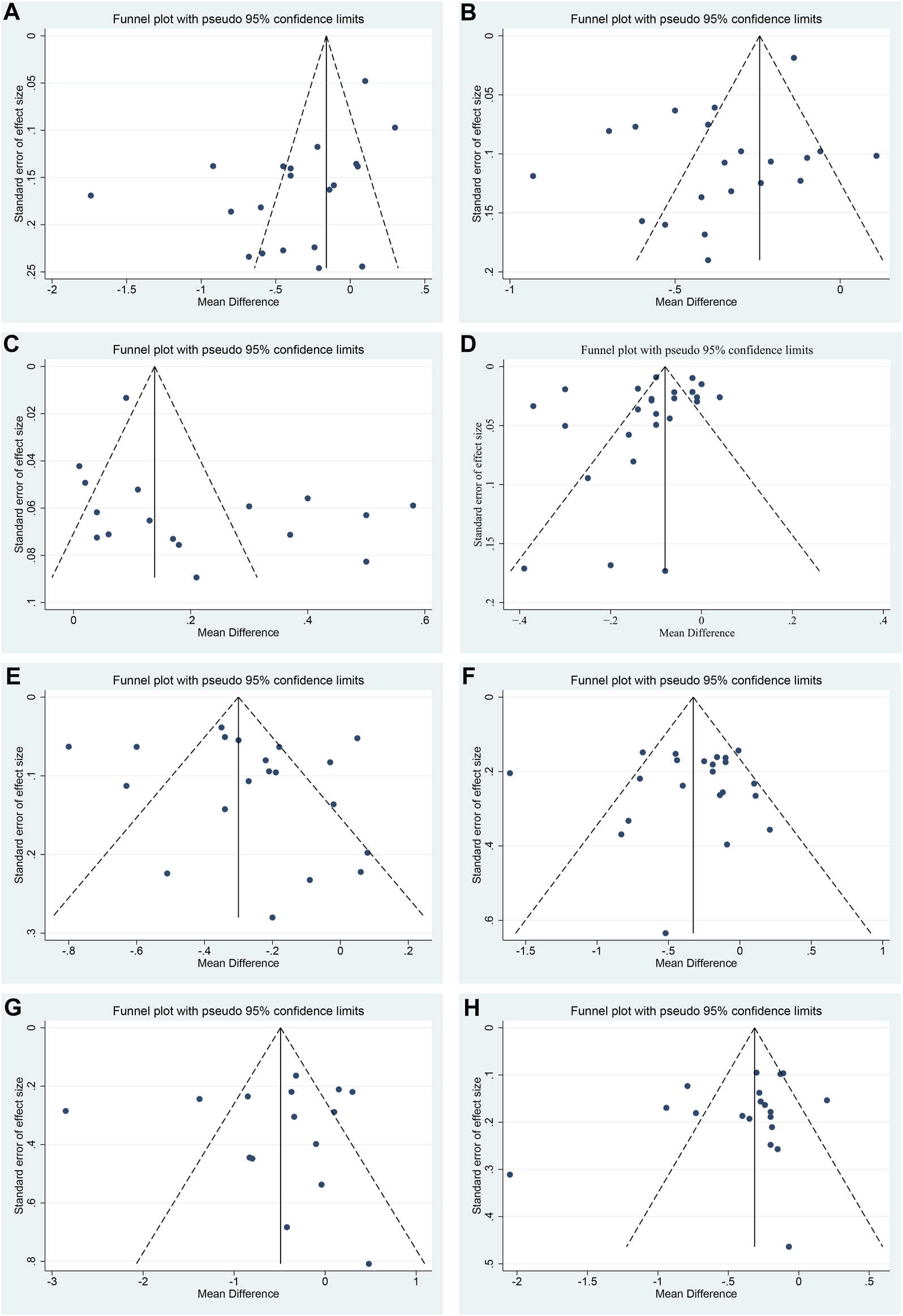 FIGURE 4. Sensitivity analysis: (A) CIMT; (B) Crouse score; (C) TC; (D) TG; (E) LDL-C; (F) HDL-C; (G) FBG; (H) 2hPG; (I) HbA1c; (J) NO; (K) ET-1; (L) HOMA-IR.