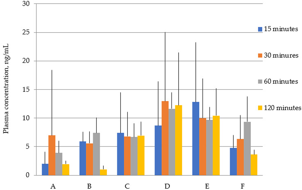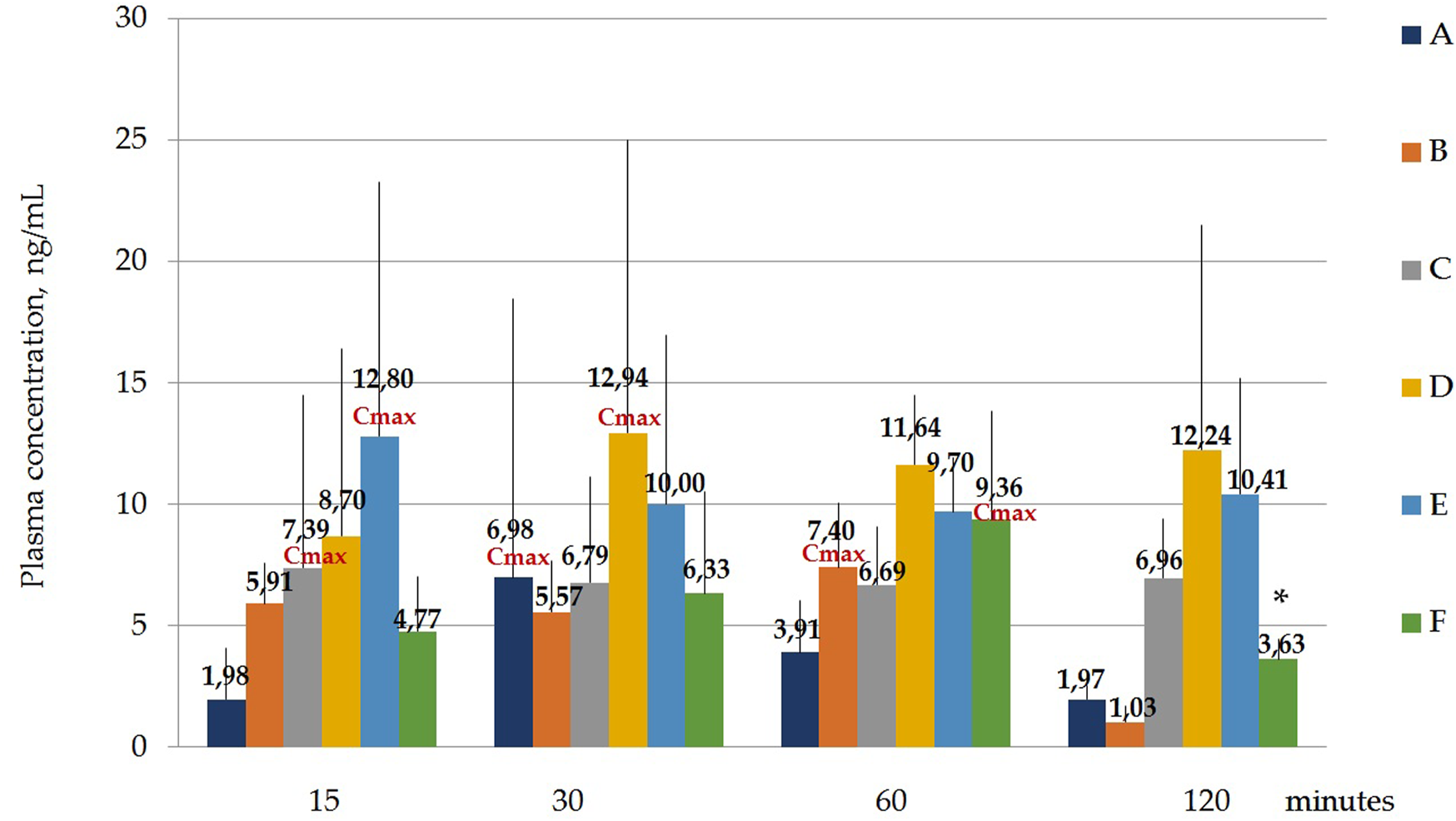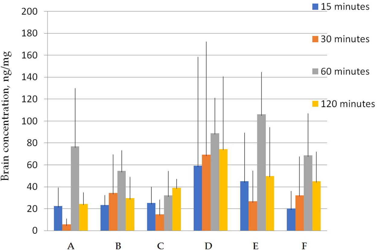 Analytical data for concentrations of latrepirdine in blood serum and in the brain tissue were processed using the Statistica 7.1 program. Descriptive statistic approach was applied: for the concentrations of latrepirdine in blood serum and in the brain tissue, the mean value and standard deviation were calculated, which are presented in the tables below. Two-way analysis of variance factorial ANOVA (ANOVA 2) was used to establish statistically significant differences associated with the factors ātimeā and ādrugā. To determine statistically significant differences in concentration between administered polymorphs at different time points, one-way ANOVA (ANOVA 1) and KruskalāWallis ANOVA analysis were used. Differences were determined at the 5% significance level (p ⤠0.05).