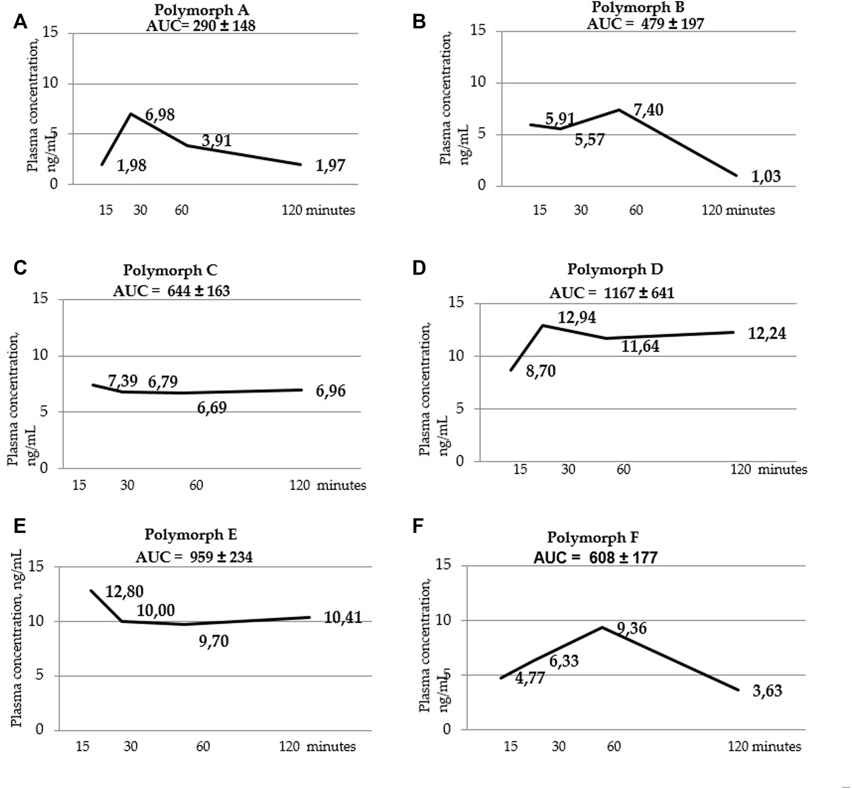 Results: When studying the pharmacokinetics, the highest bioavailability both in the blood and in the brain was demonstrated by polymorph E, whose AUC was the highest relative to other polymorphs. In the study of the cognitive-enhancing nootropic effect, polymorph E also showed the highest activity, whose values of the latent period of entering the dark chamber did not differ from control animals, and differed from other polymorphs.