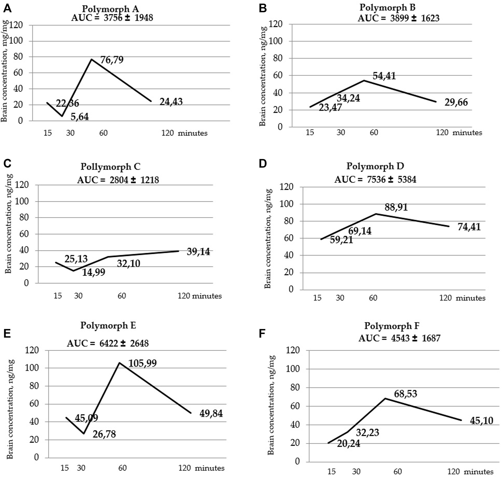 In our study of the pharmacokinetics of latrepirdine polymorphs, the bioavailability of all polymorphs in both plasma and brain was shown. Moreover, the concentrations in the brain were higher in comparison with the concentrations in plasma. The obtained data are consistent with the previous study (Wang et al., 2011), where the concentration of latrepirdine was measured after a course of oral administration.In this study, it was shown that the concentration in the brain is almost 4Ā times higher than the concentration in plasma. In our study, the concentration in the brain exceeded the concentration in plasma by about 5Ā times. We have also shown that different polymorphs have different bioavailability, characterized by AUC. That is, it can be argued that the crystalline form of latrepirdine affects the bioavailability of the drug.