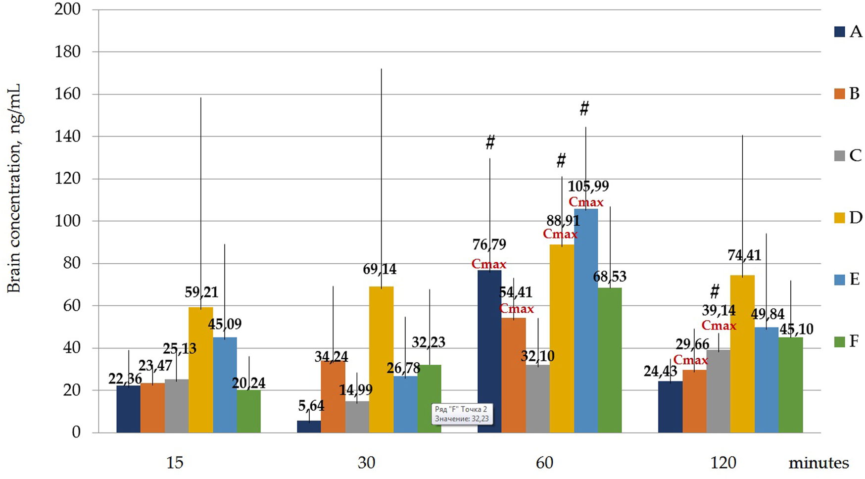 * - in animals 48 and 49, by mistake, samples were taken 110 minutes after injection (instead of 60 minutes), for this reason, animals 176 and 177 were added to group 3, subgroup 7, which were injected with Polymorph B2 for 7 days, and then blood and brain samples were taken at the 60th minute after the last injection.