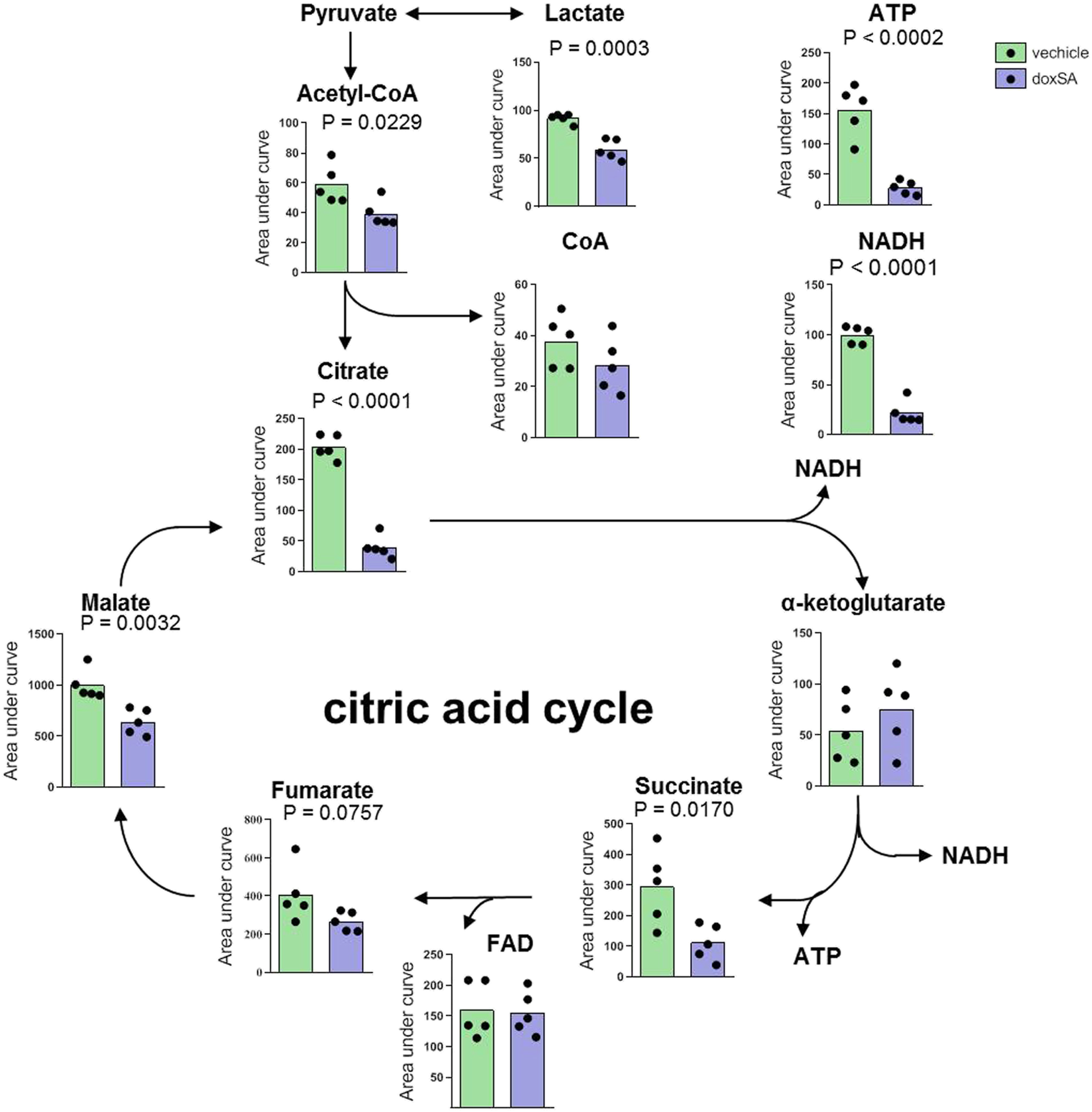Thereafter, upon inspecting the metabolomes of mitochondria-related ATP depletion, the intracellular levels of citrate cycle-related metabolites were examined by untargeted metabolomics after the exposure to doxSA (Figure 2). The analysis of identified metabolites revealed that exposure to doxSA significantly reduced lactate, acetyl-CoA, citrate, succinate, malate, and NADH (Figure 2). In addition, quantification of ATP, the final product of the mitochondrial citrate cycle, was substantially reduced in HK-2 cells subjected to doxSA treatment.