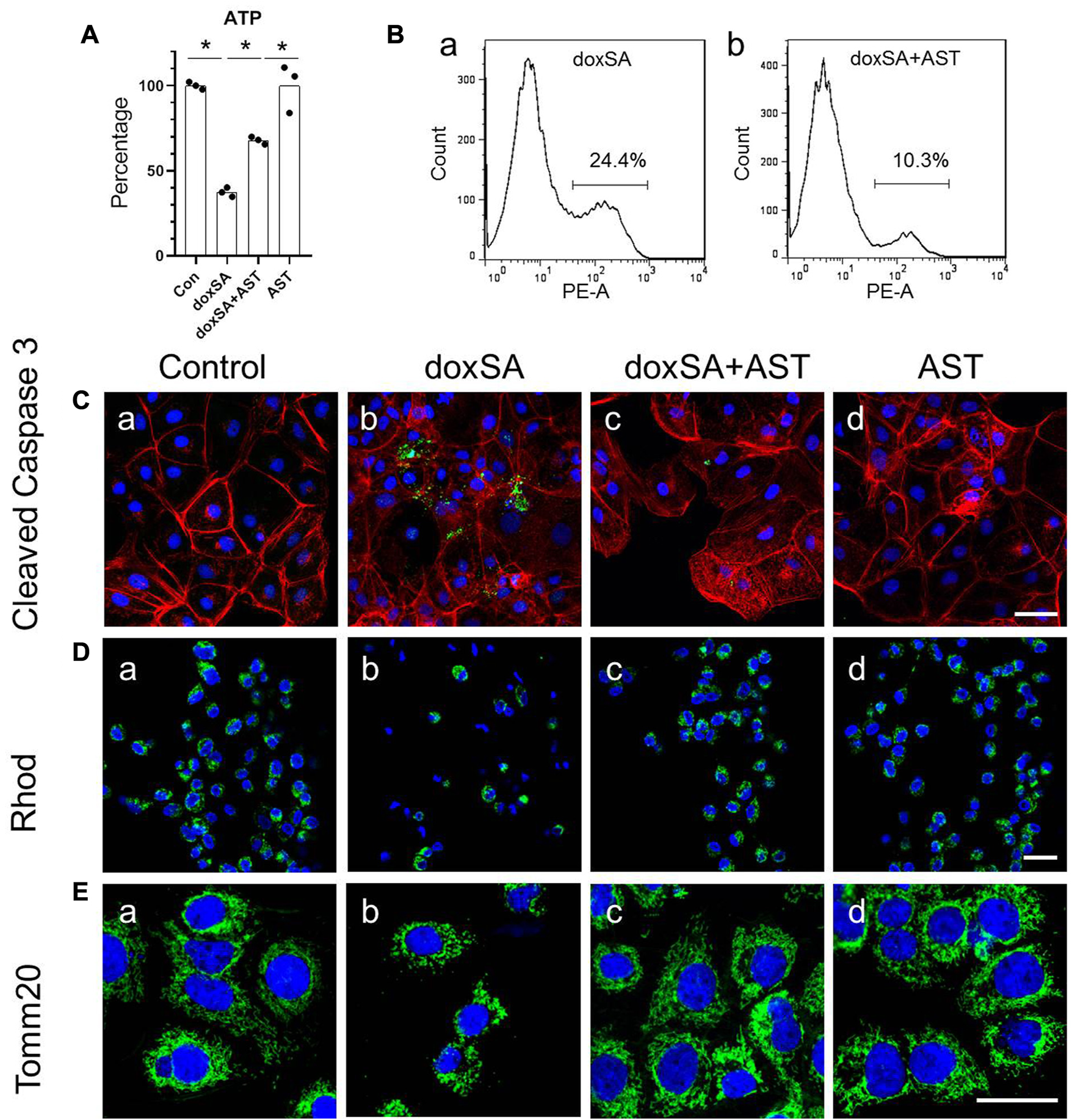 FIGURE 3. AST protected HK-2 cells from doxSA-induced mitochondrial damage. (A) doxSA-induced ATP depletion, (B) percentage of annexin-positive apoptosis in cells with (a) doxSA treatment and (b) doxSA treatment with AST. Representative images of (C) immunostaining for cleaved Caspase 3, (D) rhodamine uptake and (E) immunostaining for Tom20 in (a) control, (b) doxSA (5 μM)-treated, (c) doxSA (5 μM) +AST (200 μM)-treated, and (d) AST (200 μM)-treated cells have been shown. Scale bar = 100 μm.