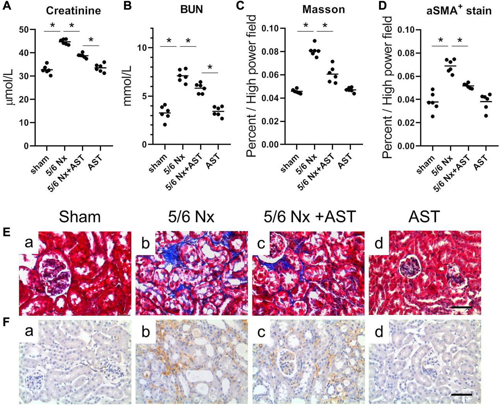 FIGURE 4. AST protected kidney against 5/6-induced injury. The serum samples were collected for the measurements of (A) creatinine, (B) BUN. (C,D) Quantitative analysis of the (C) fibrosis positive area and (D) aSMA positive area per high power field. (E,F) Representative images showing Masson staining and immunostaining for aSMA in the renal sections from (a) sham, (b) 5/6 Nx, (c) 5/6 Nx + AST and (d) AST groups (scale bar 100 μm).