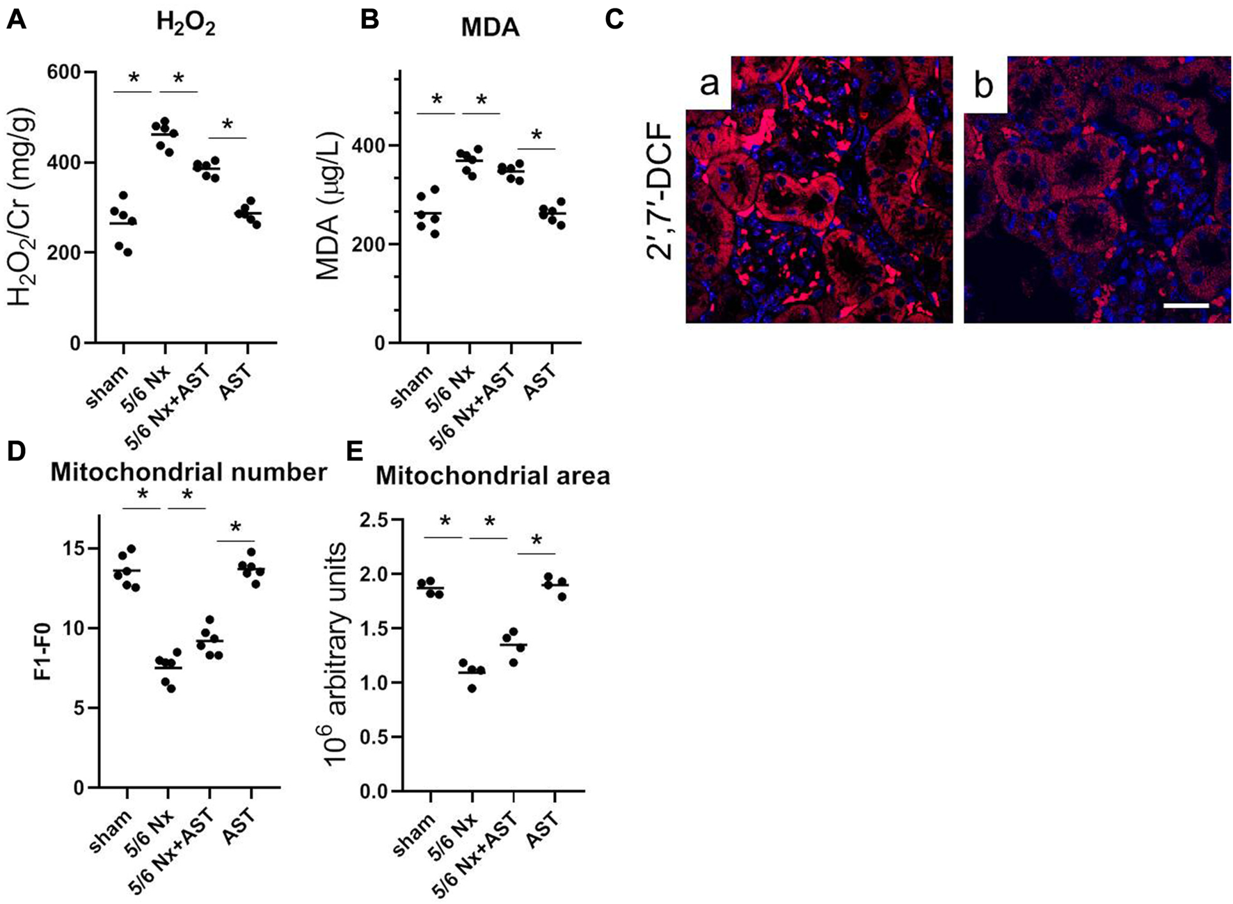 FIGURE 5. AST reduced 1-deoxySL-induced oxidative stress in 5/6 Nx rats. Quantitative analysis of (A) urinary H2O2 and (B) serum MDA from rats in sham, 5/6 Nx, 5/6 Nx + AST and AST groups. n = 6/group. The data shown are means ± SD, one-way ANOVA with Bonferroni’s test. (C) Representative images showing oxidative stress with 2′,7′-DCF staining on the fresh renal sections from (a) 5/6 Nx and (b) 5/6 Nx + AST groups (scale bar 50 μm). Quantitative analysis of electron microscopy images of (D) mitochondrial number and (E) mitochondrial area. n = 6 mice/group. The data shown are means ± SD, one-way ANOVA with Bonferroni’s test. *p < 0.05.