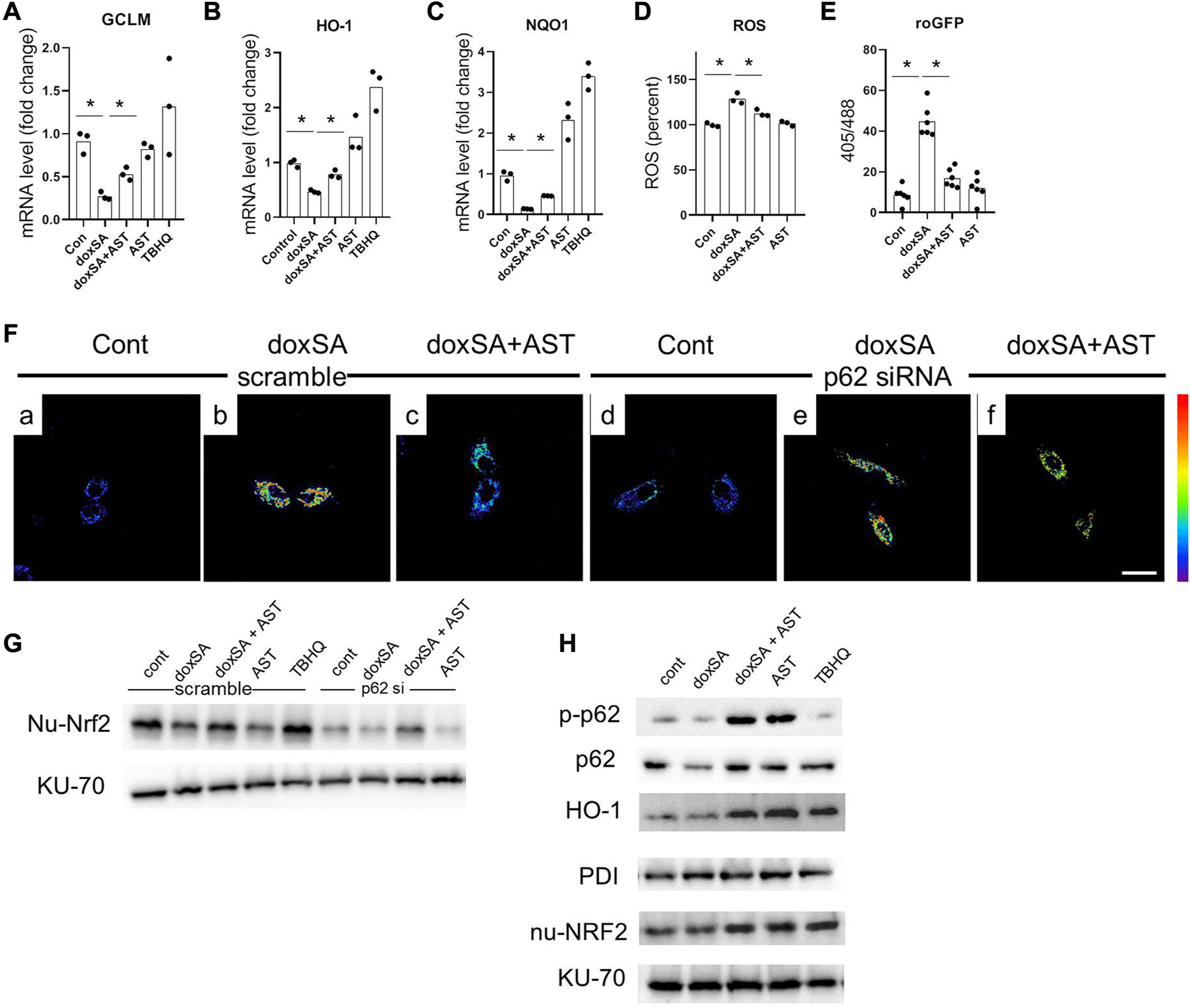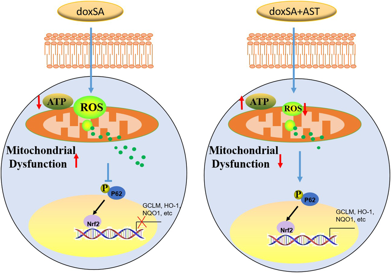 Results: The findings of in vitro experiments showed that doxSA induced mitochondrial damage, oxidative stress, and apoptosis. AST markedly reduced the level of mitochondrial reactive oxygen species, lowered apoptosis, and improved mitochondrial function. In addition, exposure to AST significantly induced the phosphorylation of p62 and the nuclear translocation of Nrf2 as well as its downstream anti-oxidant genes. p62 knock-down fully abolished Nrf2 nuclear translocation in cells after AST treatment. However, p62 knock-down did not affect TBHQ-induced Nrf2 nuclear translocation, indicating that AST can ameliorate doxSA-induced oxidative stress through modulation of p62 phosphorylation and Nrf2 nuclear translocation.