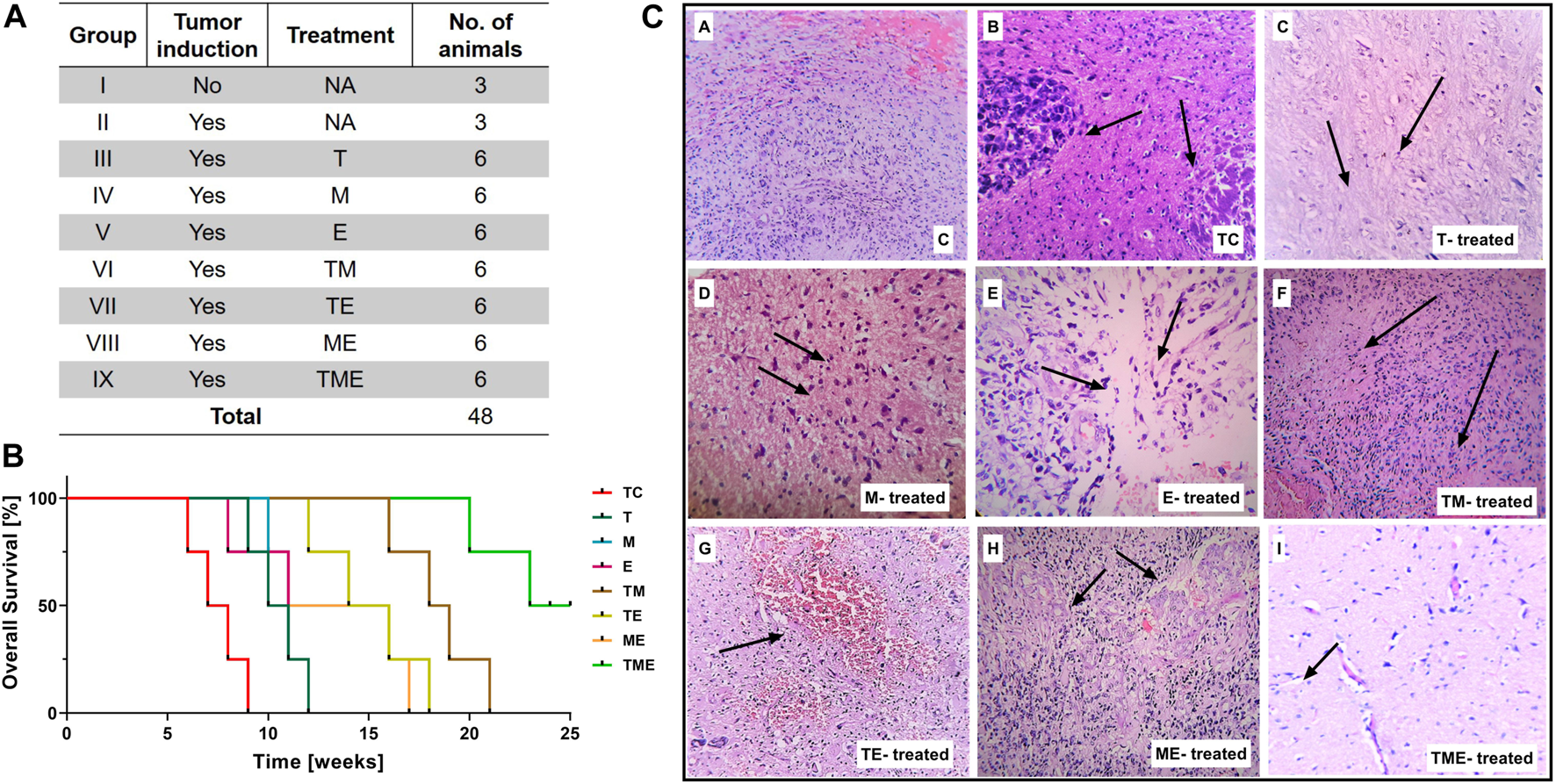 (A) Table showing the treatment strategies followed in the present study (* Survival study; # Experimental studies). (B) Kaplan-Meier survival curves were plotted and statistical analysis (Wilcoxon-Gehan test) was performed. (C) H & E staining of tumor sections from various treatment groups. Images were captured at 20x magnification, wherein the images (C–a) and (C–b) correspond to (C) and TC, while (C–c) to (C–i) correspond to treatment with “T,” “M,” “E,” TM, TE, ME and TME.